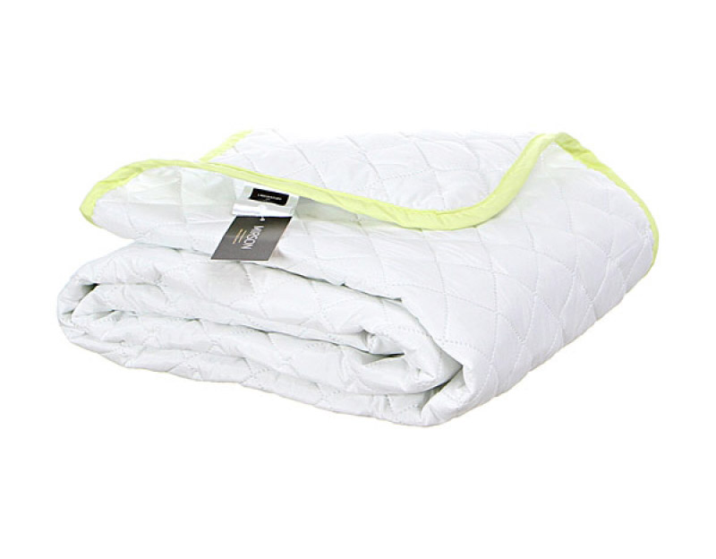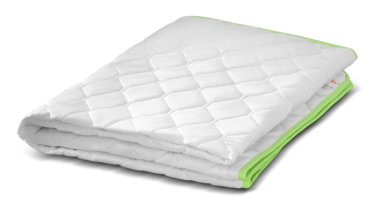 Легкое одеяло для лета. Чехол одеяла выполнен из качественного итальянского микросатина белого цвета с салатовым кантом. Ткань на основе хлопка и полиэфирного волокна простая в уходе, мягкая и приятная на ощупь. Наполнитель из волокна eco-soft не вызывает аллергии, легкий и нежный, отлично пропускает воздух, практичный в эксплуатации, не сбивается, равномерно распределен и простеган по всему изделию.