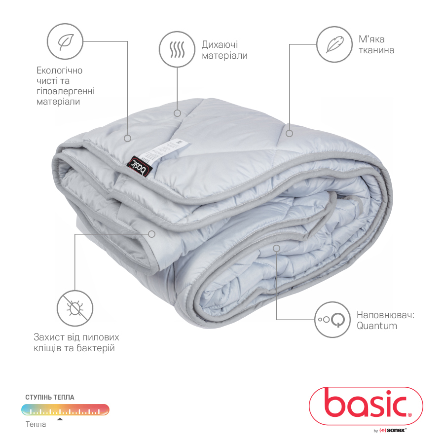 Одеяло антиаллергенное демисезонное Basic Silver Sonex. В одеяле используется ткань микрофайбер, мягкая и приятная на ощупь. Ткань обработана специальной антибактериальной пропиткой. Наполнитель - инновационное антиаллергенное волокно Quantum, обеспечивающее повышенную защиту от аллергенов. Подходит для людей, страдающих аллергией.