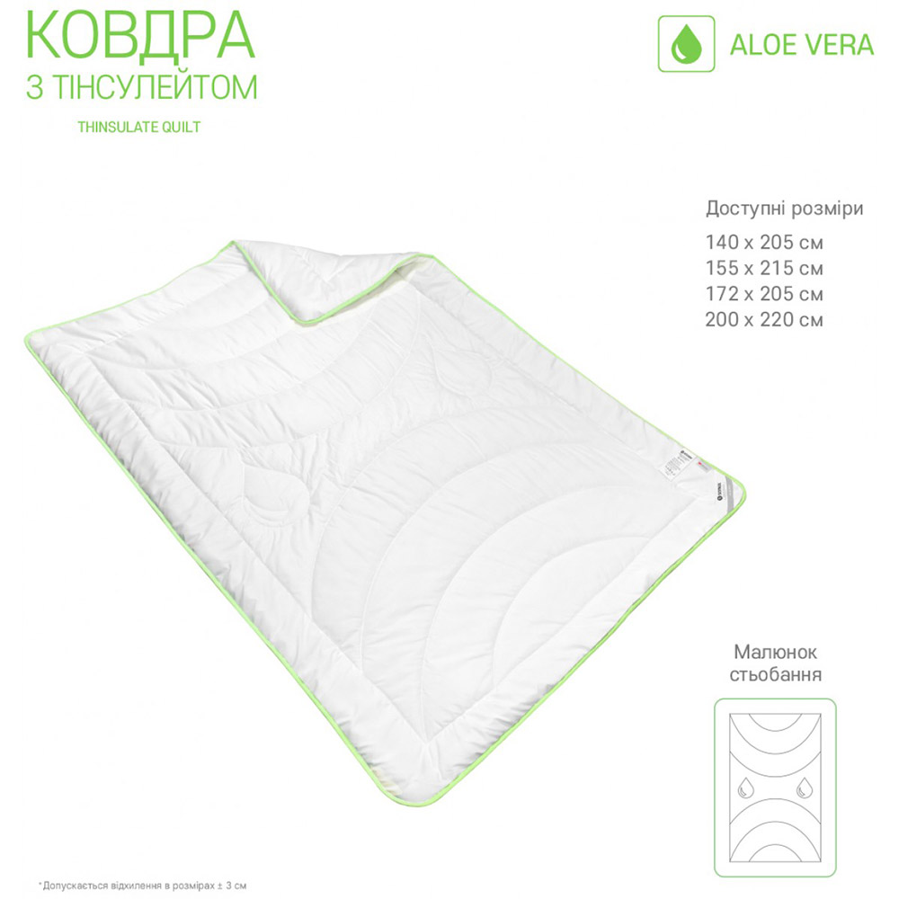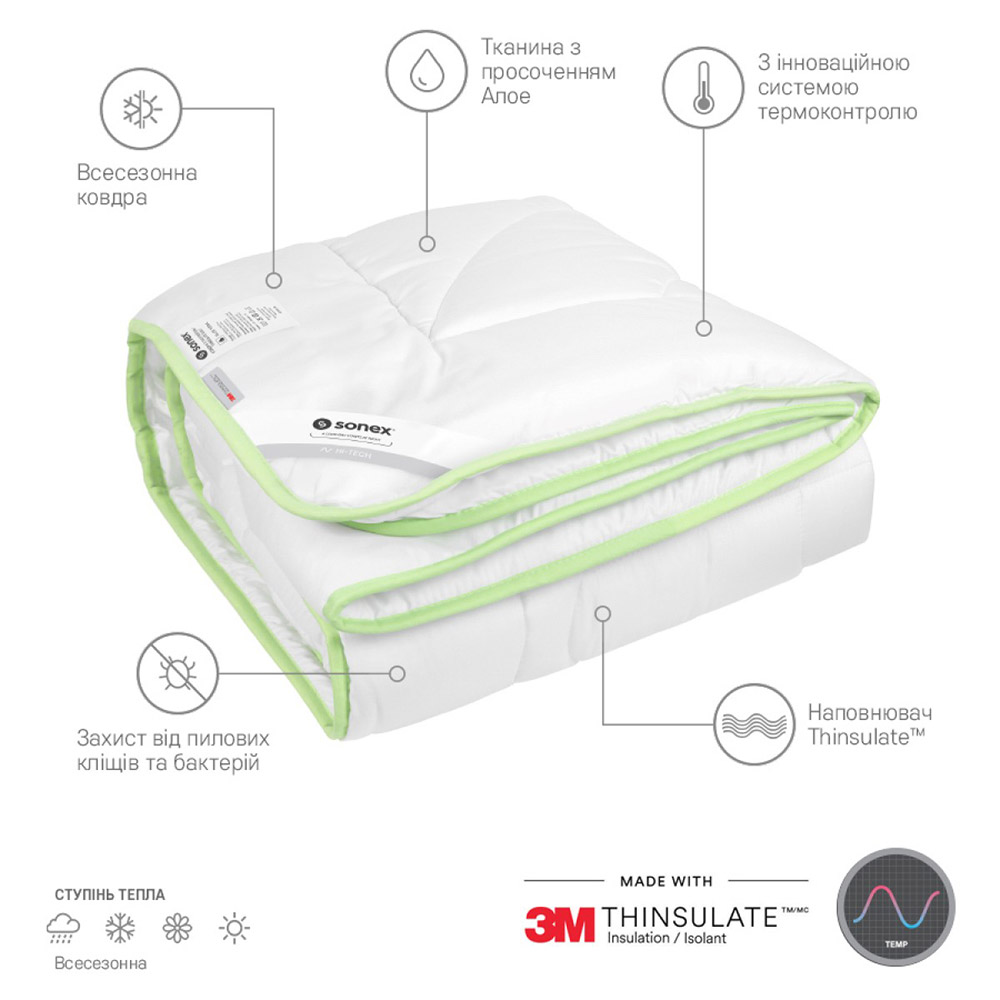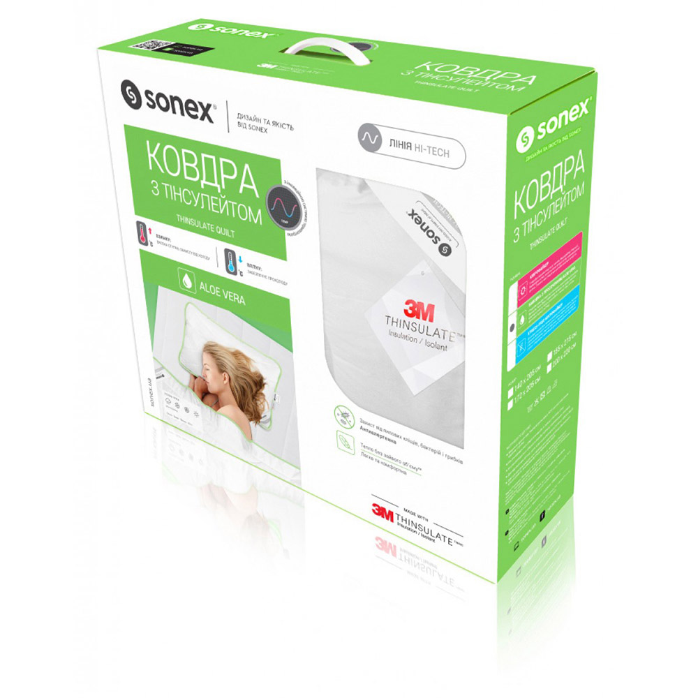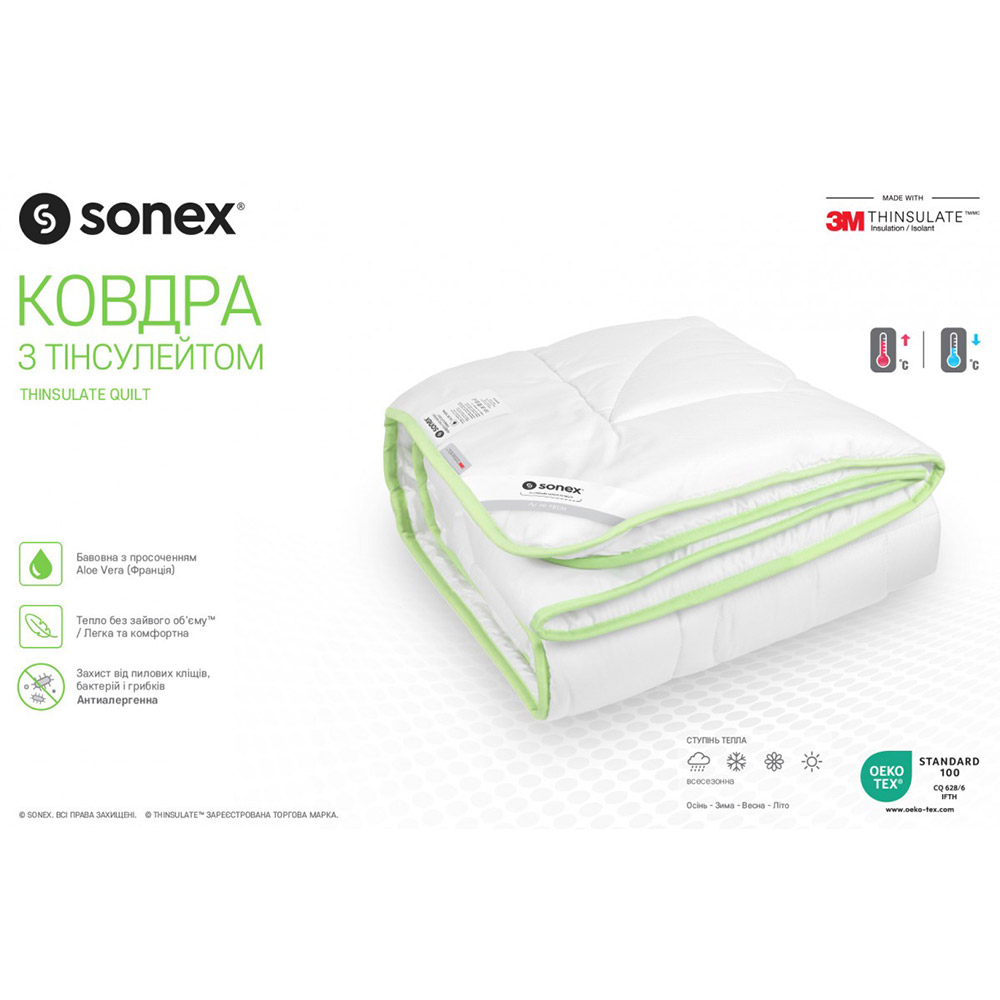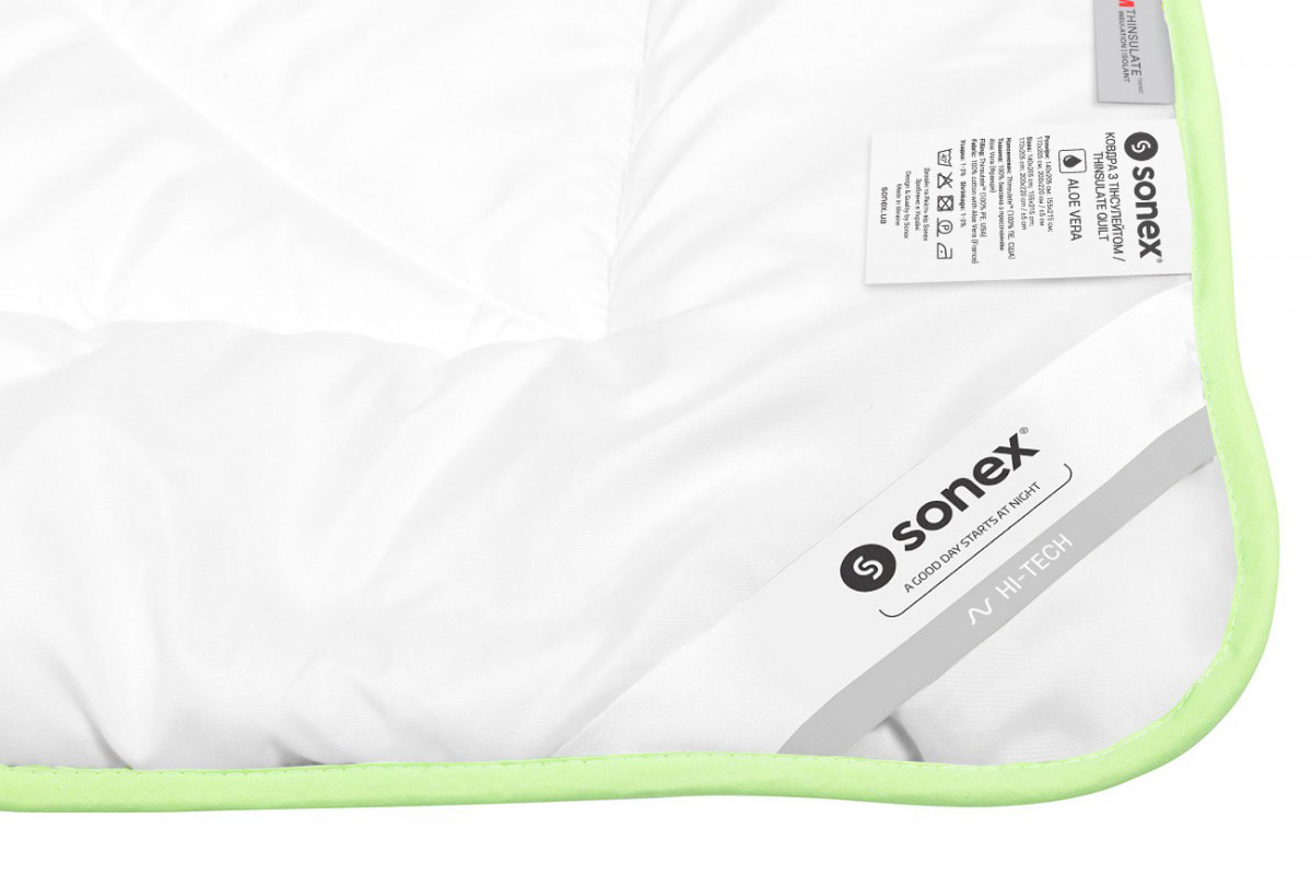 Одеяло с Тинсулейтом Алоэ Вера Sonex – создано из высококачественных антиаллегренных материалов. В состав изделия входит хлопок с пропиткой Алоэ Вера, которое оказывает благотворное влияние на кожу, увлажняя ее и создавая тонизирующий эффект. Отличный мягкий друг для сна, обладает уникальной «дышащей» способностью, под ним не жарко спать летом, и тепло зимой.