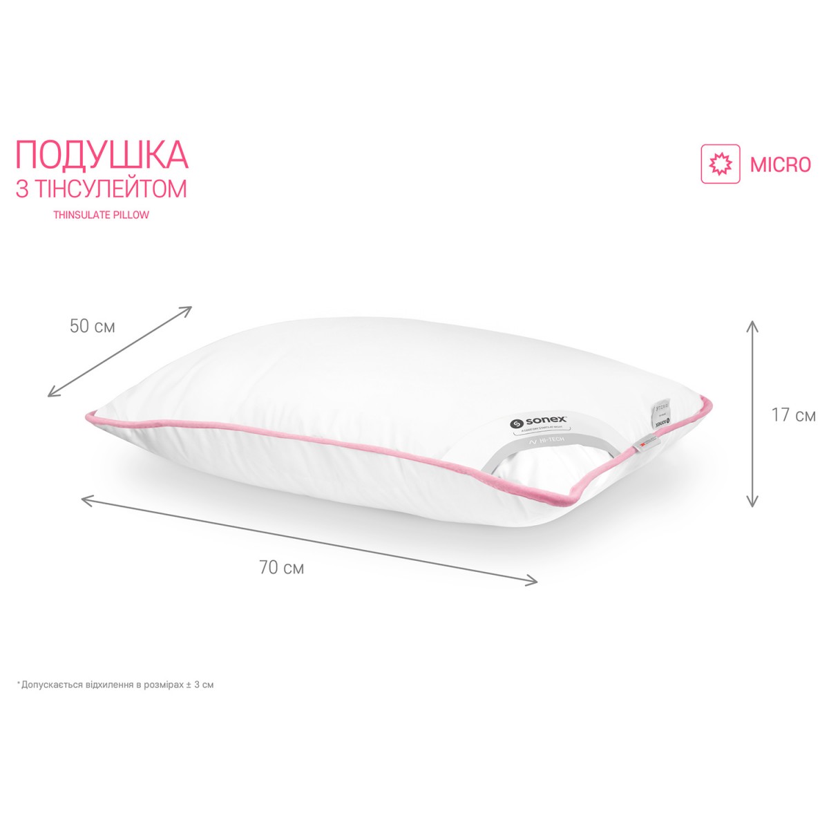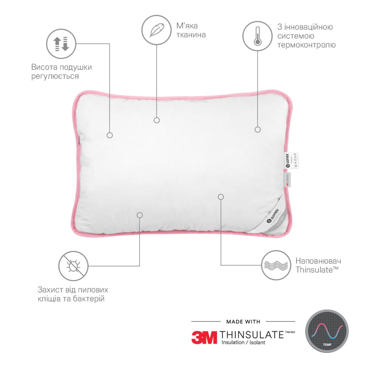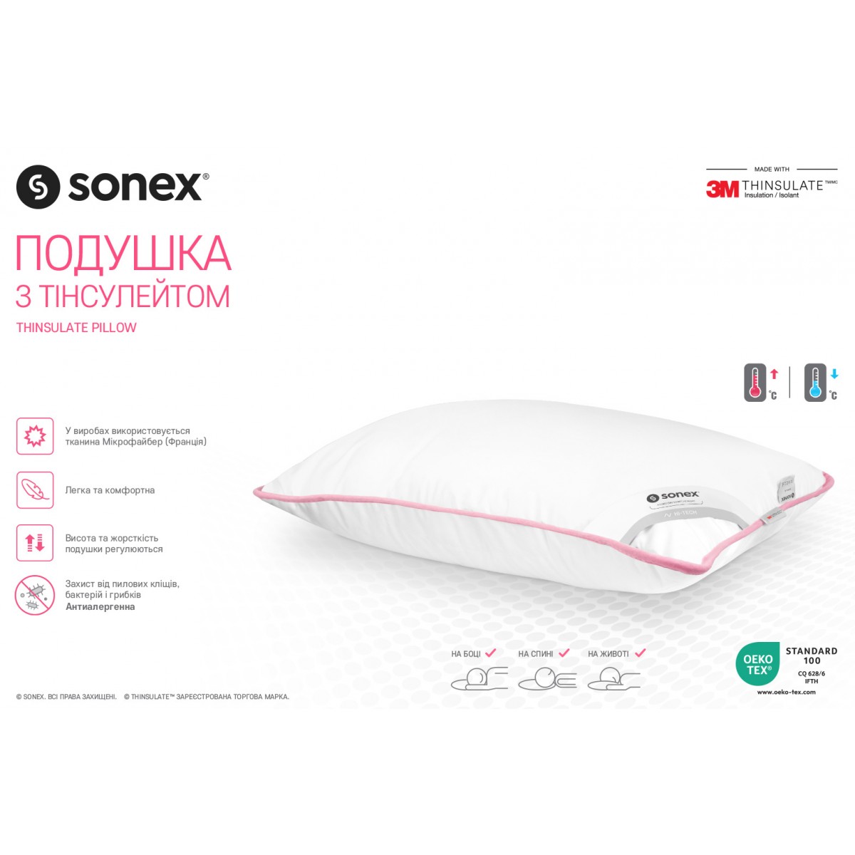 Подушка с Тинсулейтом Sonex - создана из экологически чистых и гипоаллергенных материалов. Благодаря наполнителю Тинсулейт подушка гарантирует наиболее лучшие гигиенические свойства, чем натуральные и синтетические материалы. Ткань верха подушки пропитана специальной антибактериальной пропиткой, на ощупь подушка мягкая и шелковистая. Спать на такой подушке – одно удовольствие!