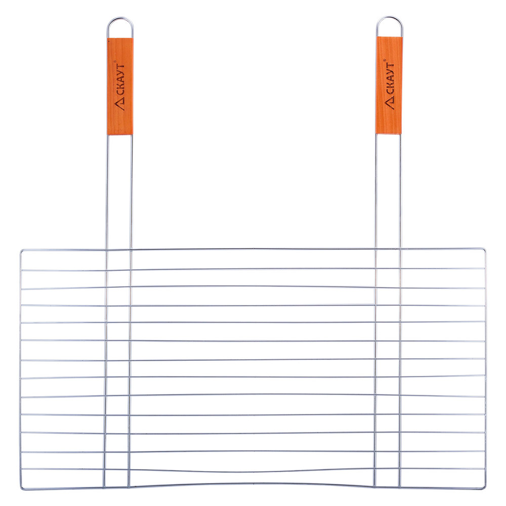 Плоская прямоугольная металлическая решетка с двумя деревянными ручками. Решетки незаменимы для приготовления пищи на открытом воздухе. Решетка выполнена из хромированной стали, подходит для приготовления разных продуктов. Специальная конструкция позволяет удобно закрепить решетку на мангале или жаровне.