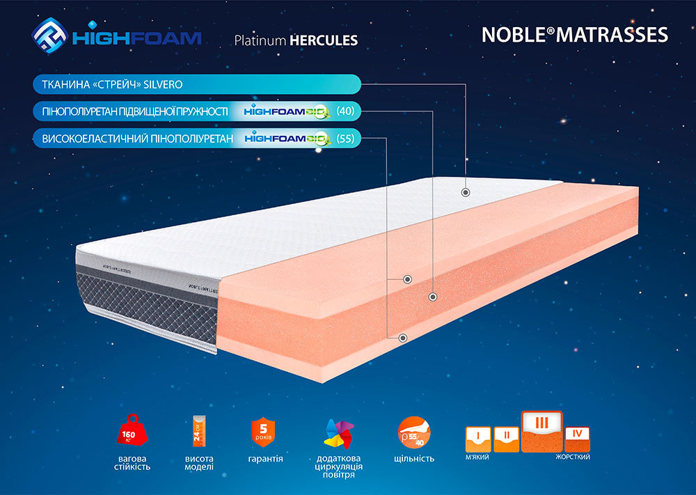 Матрас Platinum Hercules от Тм Noble - это высококачественный матрас из материалов нового поколения. Благодаря комбинации самых прочных материалов HighFoam BIO, модель характеризуется высоким уровнем комфорта в сочетании с высокой несущей способностью. Неравномерная структура высокоэластичного пенополиуретана создает эффект обтекания, при этом слой повышенной упругости удерживает жесткую структуру матраса, позволяя избежать ощущения проваливания.