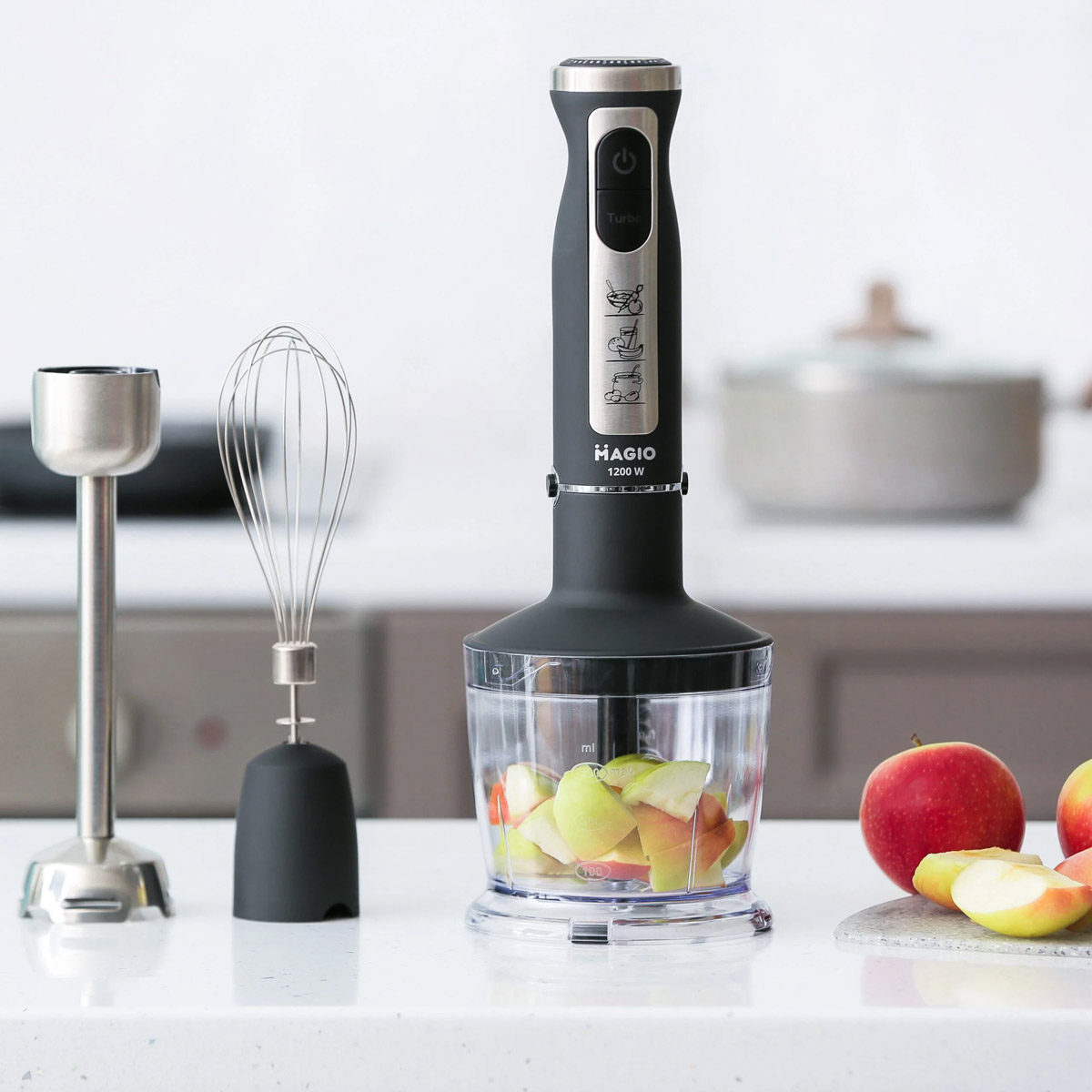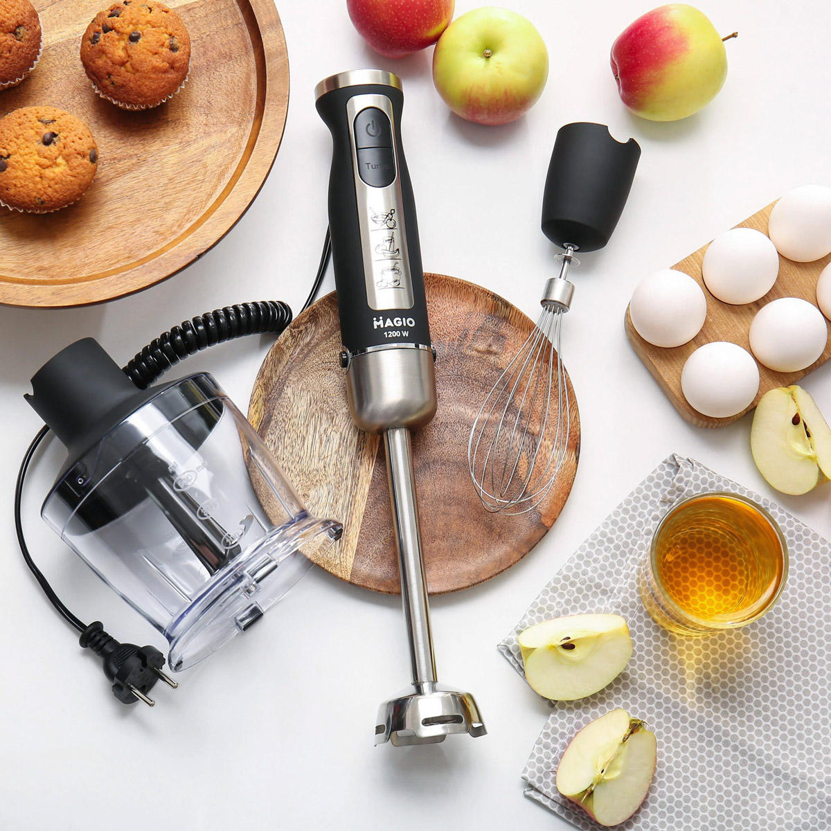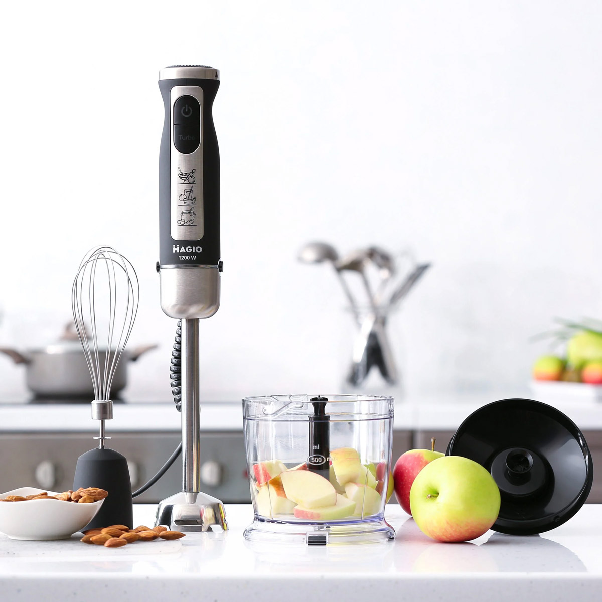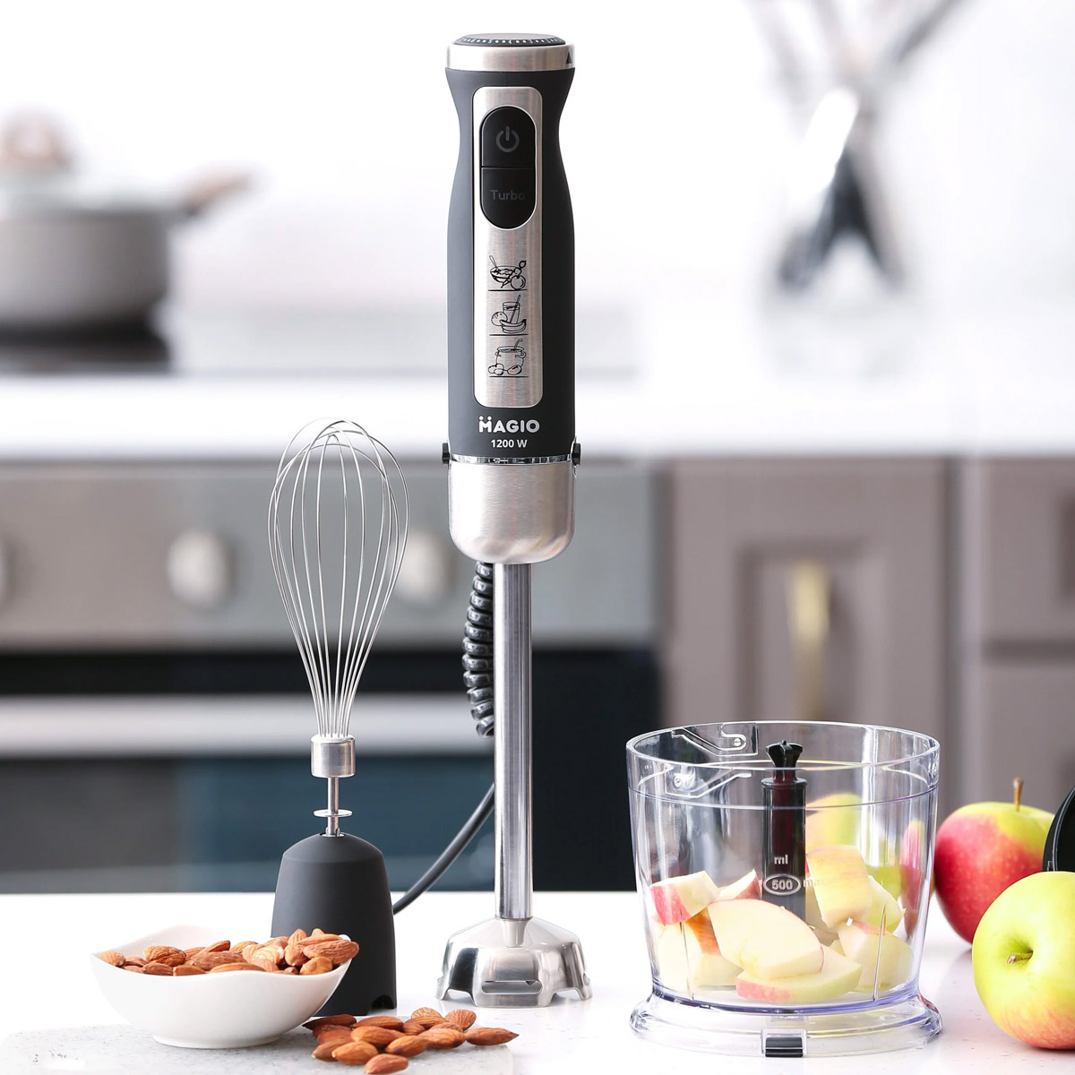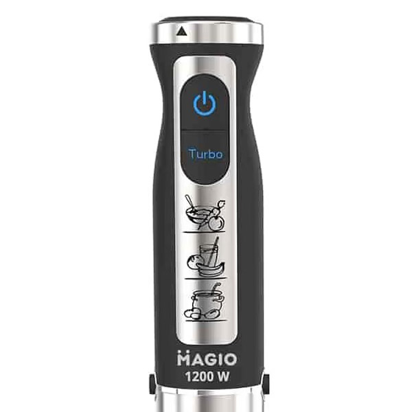 Блендерный набор позволяет готовить разнообразные блюда быстро и удобно. Погружная часть и нож выполнены из нержавеющей стали, обеспечивая долговечность и устойчивость к износу. Эргономичная рукоятка с покрытием Soft Touch удобно лежит в руке, а 19 скоростей регулируются плавно с помощью переключателя на рукоятке. В комплект входят венчик для взбивания и мини-измельчитель объемом 500 мл. Компактный дизайн делает блендер практичным помощником на кухне. Magio — бренд мелкой бытовой техники, предлагающий стильные и функциональные устройства для кухни и дома. Продукция бренда производится с соблюдением международных стандартов качества и долговечности. В ассортименте Magio есть блендеры, кофеварки, тостеры, мясорубки, фены и другие приборы. Все устройства разрабатываются с учетом современных технических и дизайнерских тенденций. Бренд обеспечивает гарантию и сервисное обслуживание по всей Украине.