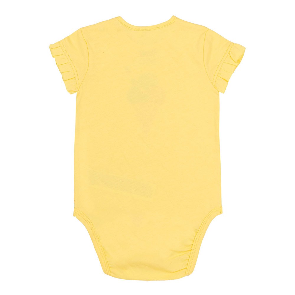 Боди лимонного цвета с симпатичным принтом и короткими рукавами. Модель подойдет для девочки. Боди выполнено из ткани супрем, на 95% состоящей из натурального хлопка. Материал легкий, приятный, отлично пропускает воздух, замечательно подойдет для лета. Боди обеспечивает максимальную мягкость и комфорт для нежной детской кожи. Боди имеет удобное крепление на кнопках на плече и внизу, что делает его надевание и снятие максимально простым.