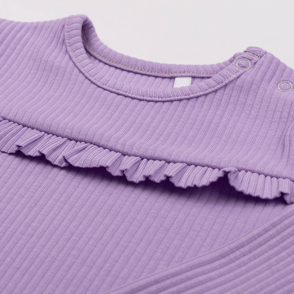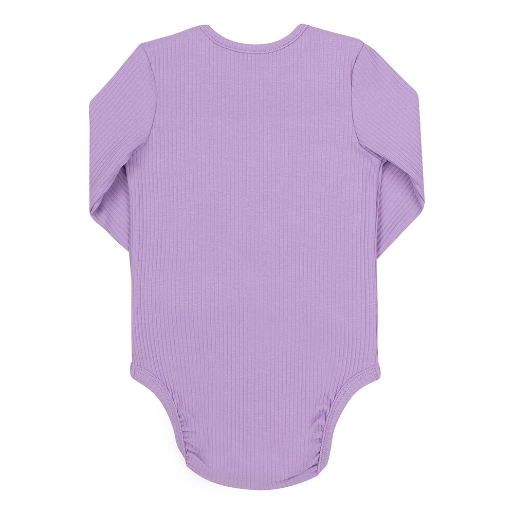 Однотонное боди сиреневого цвета с длинными рукавами и с декоративной рюшей. Модель подойдет для девочки. Боди выполнено из трикотажной натуральной хлопковой ткани с рельефными полосками. Материал приятный на ощупь, хорошо пропускает воздух. Боди обеспечивает максимальную мягкость и комфорт для нежной детской кожи. Боди имеет удобное крепление на кнопках на плече и внизу, что делает его надевание и снятие максимально простым.
