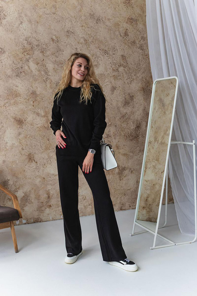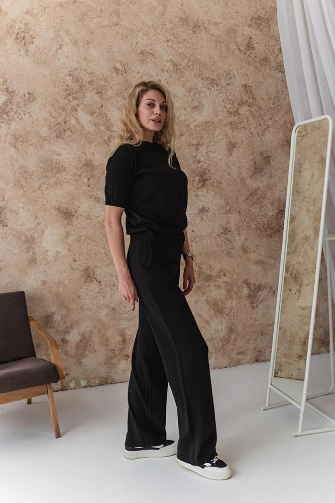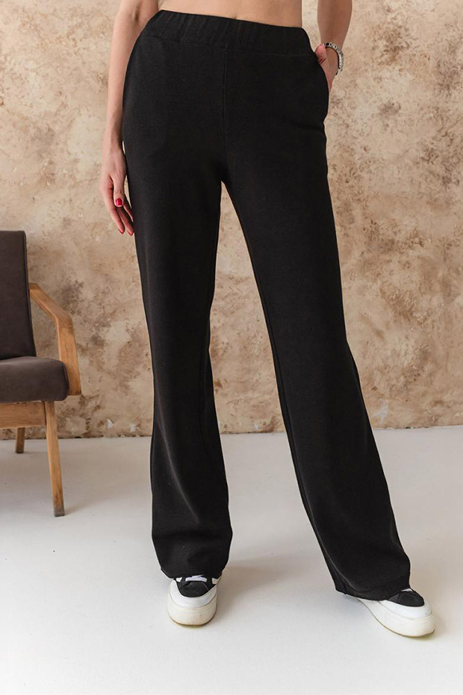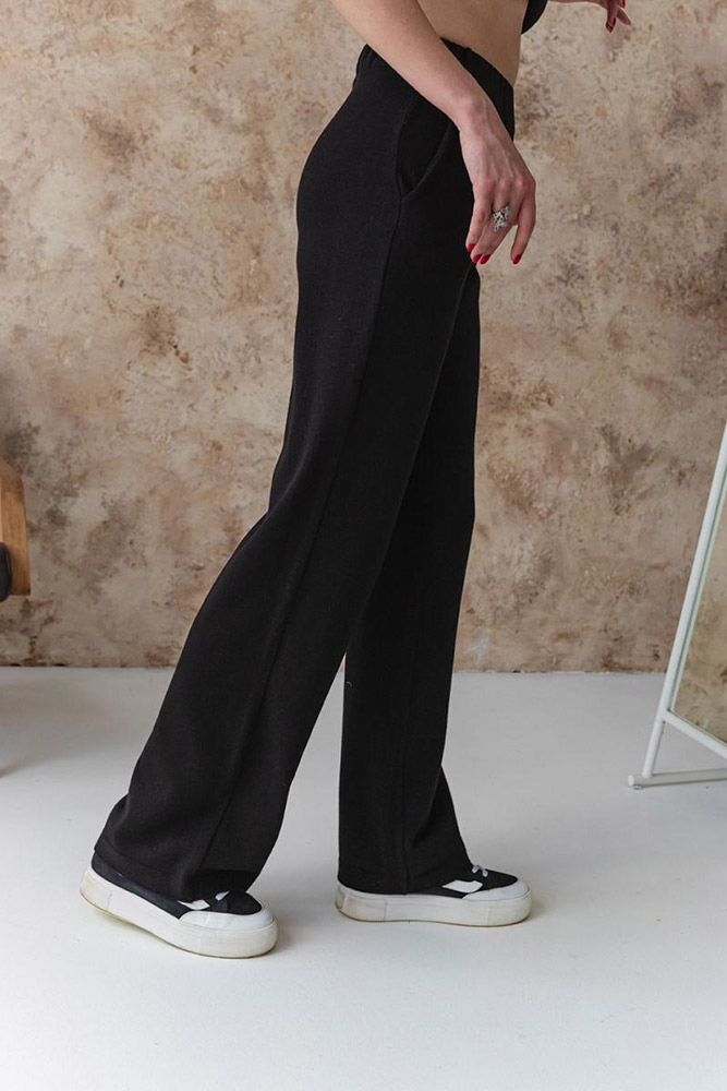 Однотонные стильные штаны черного цвета. Модель машинной вязки, свободного кроя, с боковыми карманами. Штаны удобные и практичные, хорошо смотрятся на любой фигуре. Брюки выполнены из мягкого качественного материала на основе хлопка и акрила.