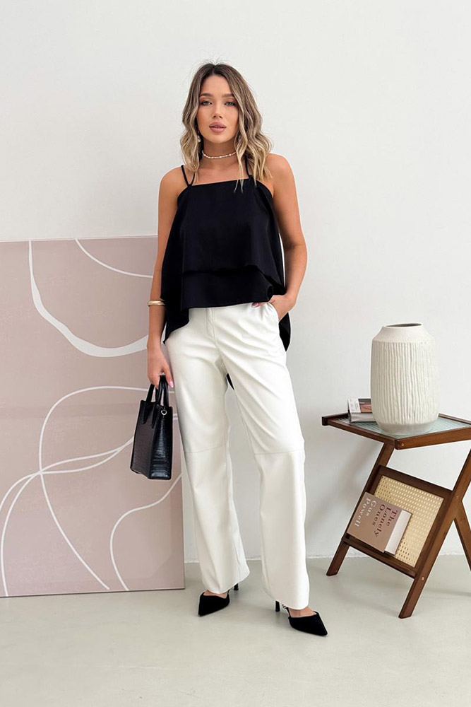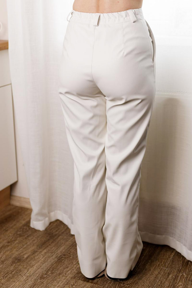 Однотонные кожаные штаны белого цвета. Модель с высокой посадкой на талии, сзади на поясе резинка. Штаны станут отличной базой для создания модного образа, замечательно дополнят гардероб. Материал из искусственной кожи приятный на ощупь и комфортный.