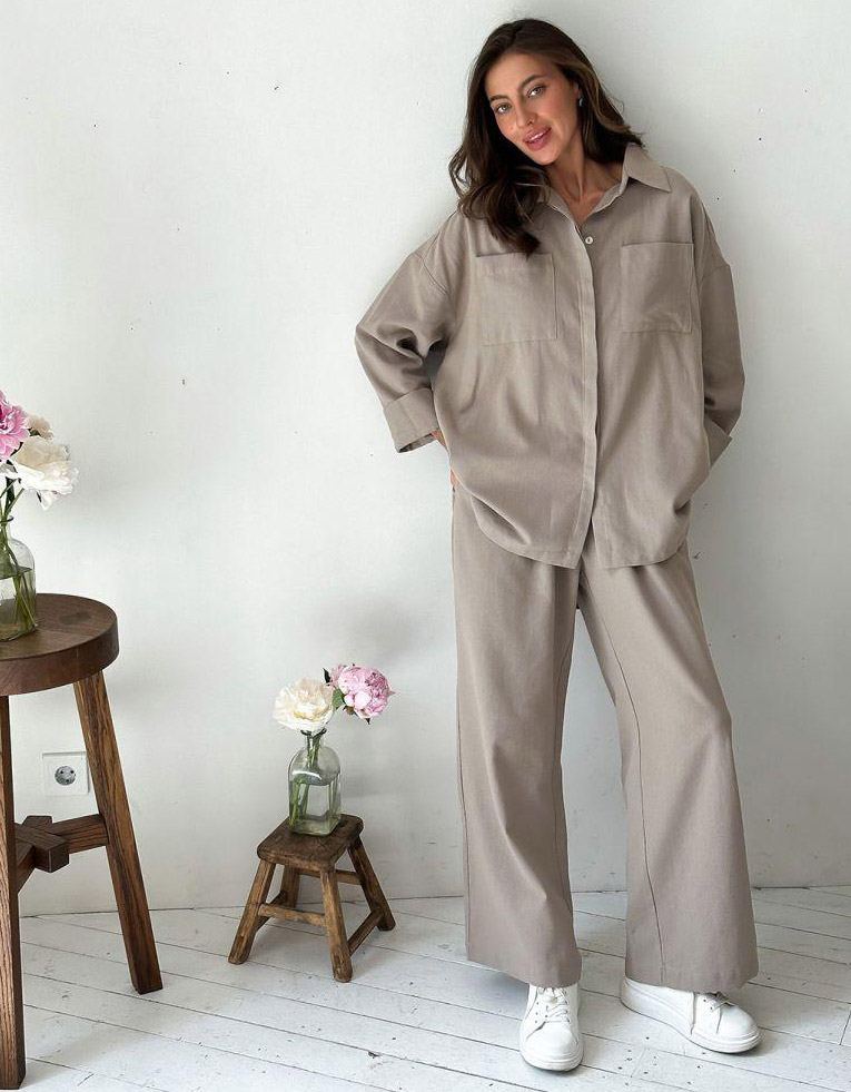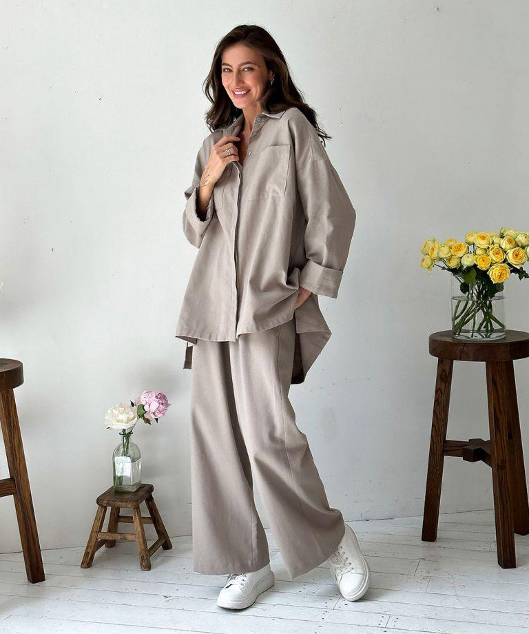 Стильные однотонные штаны нейтрального серо-бежевого оттенка. Модель свободного кроя, с боковыми прорезными карманами и удобной широкой резинкой на поясе. Штаны выполнены из натуральной ткани на основе хлопка и льна. Материал легкий и приятный на ощупь, прекрасно пропускает воздух, гипоаллергенный, не электризуется. Эти штаны станут отличным выбором для модных женщин, стремящихся выглядеть стильно и чувствовать себя комфортно.