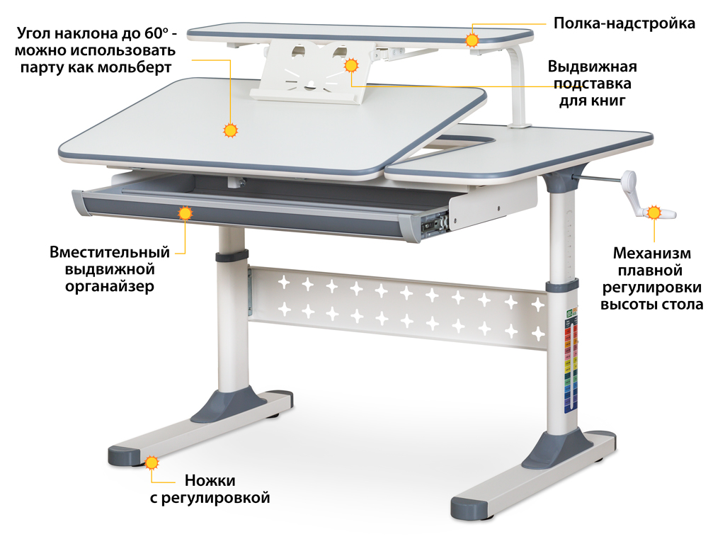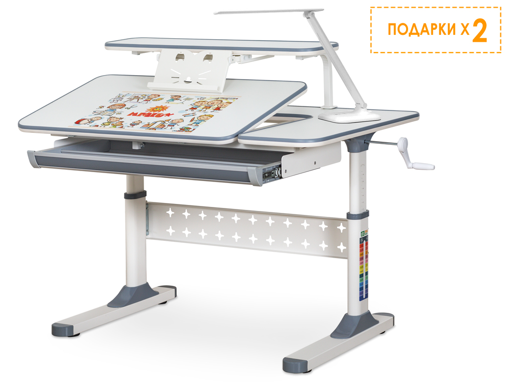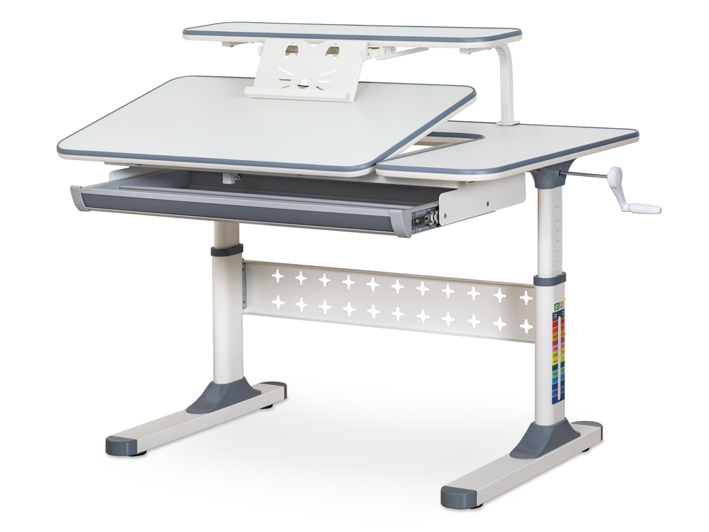 Детский стол Ergokids TH-320 Grey TH-320 W/G. Столешница разделена на подвижную и неподвижную части. Подвижная часть столешницы изменяет угол наклона до 60 градусов. Плавность регулировки обеспечивает газлифт. Для изменения положения столешницы достаточно мягко нажать на рычаг и потянуть на себя. Для безопасности регулировки детьми на столешнице предусмотрен промежуток, чтобы не прищемить пальцы. Благодаря большому диапазону угла наклонной столешницы можно использовать как мольберт. Изменение высоты всего стола производится с помощью червячного механизма ручкой, которую можно установить слева или справа. Вдоль всей поверхности столешницы и полки закреплена специальная кромка, защищающая стол от повреждений, а ребенка от повреждений острыми краями. Стол имеет большой выдвижной органайзер, расположенный под столешницей, изготовленный из прочного, безопасного пластика.