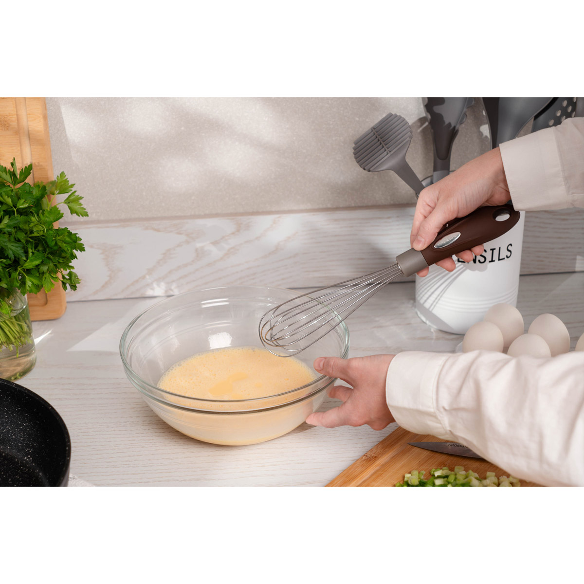 Венчик из серии Gemini - идеальный кухонный инструмент для взбивания различных смесей, таких как кремы, муссы и соусы. Изготовлен из термостойкого нейлона, который бережно работает с антипригарными покрытиями, не повреждая их. Эргономичная рукоятка из безопасного пластика с вставкой из нержавеющей стали обеспечивает комфорт при использовании. Изделие можно легко мыть в посудомоечной машине, что добавляет удобства в уходе за этим аксессуаром.