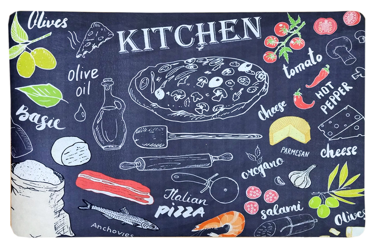 Функциональный и стильный коврик для кухни. Симпатичный разноцветный рисунок с разными продуктами и надписью "Kitchen" замечательно дополнит кухонный интерьер. Коврик выполнен из ПВХ и полиэстера. Такой состав обеспечивает изделию практичность и долговечность, делает его идеальным выбором для использования на кухне. Нескользящее основание надежно фиксирует коврик на полу, предотвращая его смещение. Этот коврик – это не только защита пола от повреждений и грязи, но и элемент декора, способный подчеркнуть индивидуальность вашего пространства.