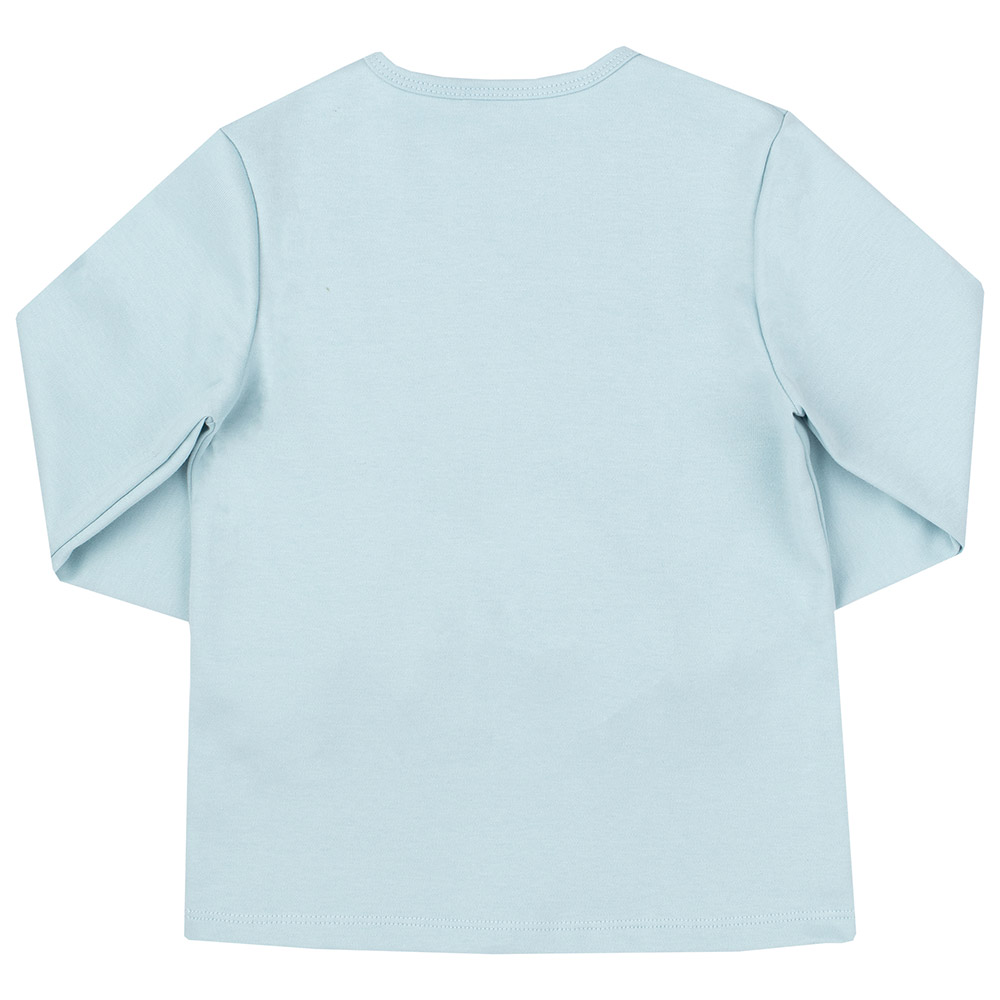 Стильный и удобный лонгслив голубого цвета с симпатичным принтом. Модель прямого кроя, с круглой горловиной, на левом плече - застежка на кнопки.