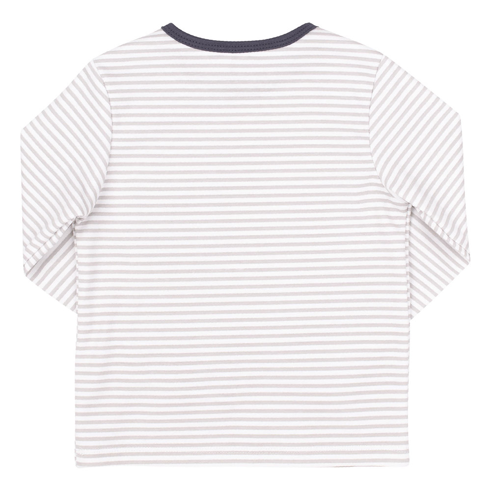 Стильный и удобный лонгслив с серымиполосками. Модель прямого кроя, с круглой горловиной, спереди - накладной кармашек, на левом плече - застежка на кнопки.