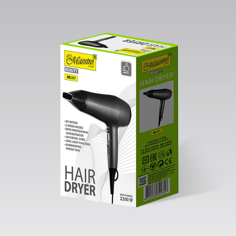 Фен с мощным двигателем DC обеспечит быструю и бережную сушку волос. Оснащён профессиональным концентратором для точной укладки и создания объёма. Две скорости позволяют подобрать оптимальные настройки для любого типа волос. Режим подачи холодного воздуха фиксирует укладку, придавая ей стойкость. Встроенная защита от перегрева гарантирует безопасность использования и продлевает срок службы устройства. На ручке есть петля для удобного подвешивания. Вращение шнура на 360 градусов.