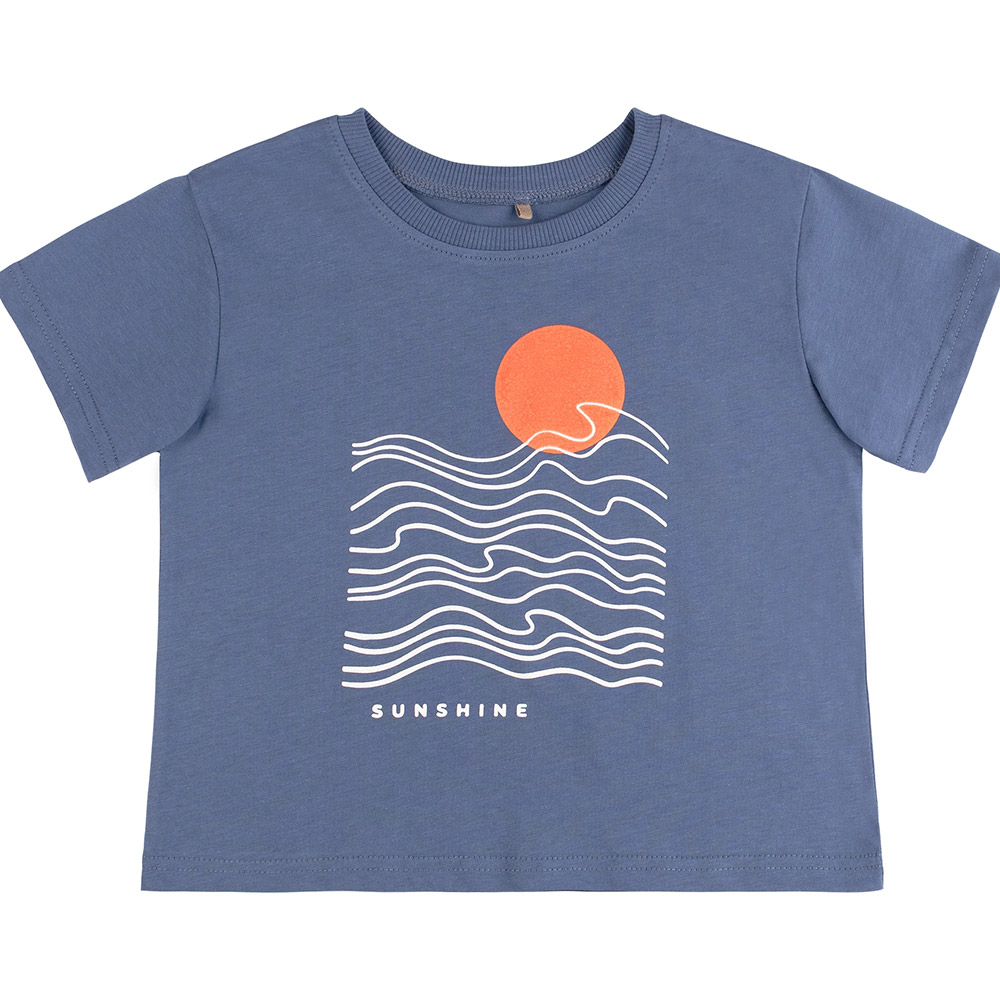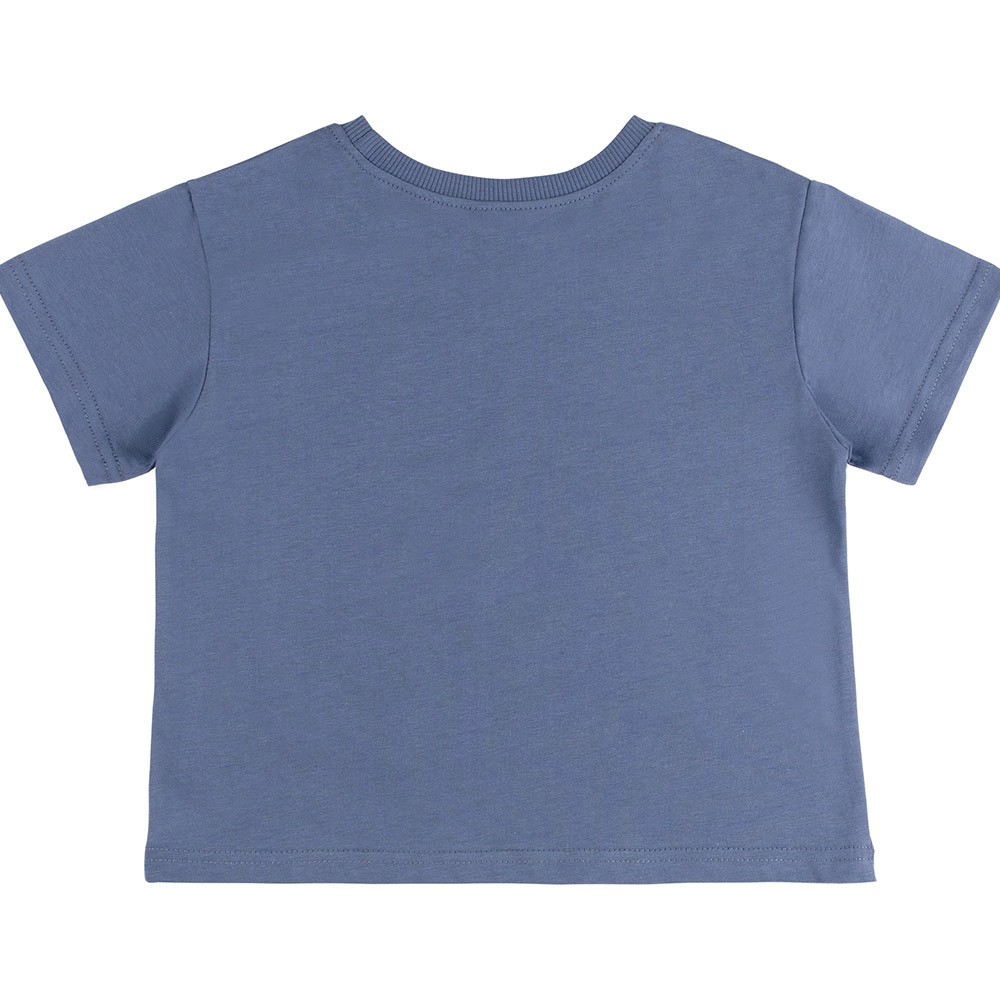 Футболка синего цвета, спереди — стильный принт. Модель подойдет для мальчика. Футболка прямого кроя, с круглой горловиной и с короткими рукавами. Футболка выполнена из ткани супрем. Натуральный хлопковый материал легкий, мягкий и приятный на ощупь, хорошо пропускает воздух, идеально подходит для детской кожи.