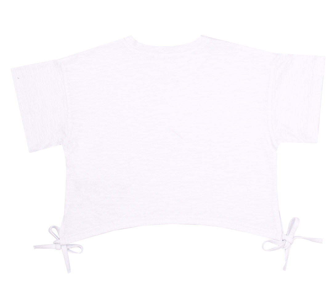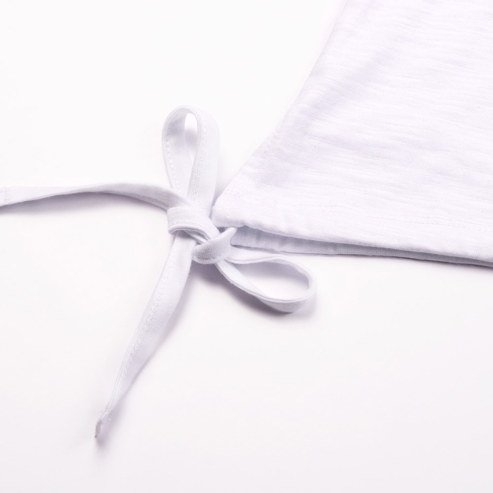 Однотонная стильная футболка белого цвета, низ регулируется шнуром. Модель подойдет для девочки. Футболка укороченная, свободного кроя, с короткими рукавами и с круглой горловиной. Футболка выполнена из ткани супрем. Хлопковый материал легкий, мягкий и приятный на ощупь, хорошо пропускает воздух, идеально подходит для детской кожи.