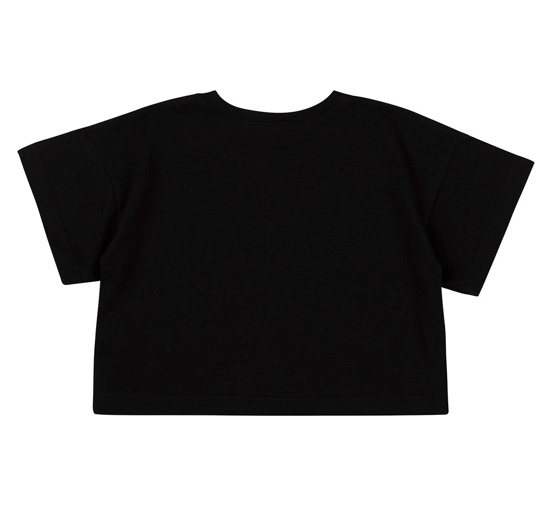 Детская футболка черного цвета, спереди стильный разноцветный принт-надпись. Модель подойдет для девочки. Футболка укороченная, с круглой горловиной и короткими рукавами. Футболка выполнена из ткани супрем. Хлопковый материал легкий, мягкий и приятный на ощупь, хорошо пропускает воздух, идеально подходит для детской кожи.