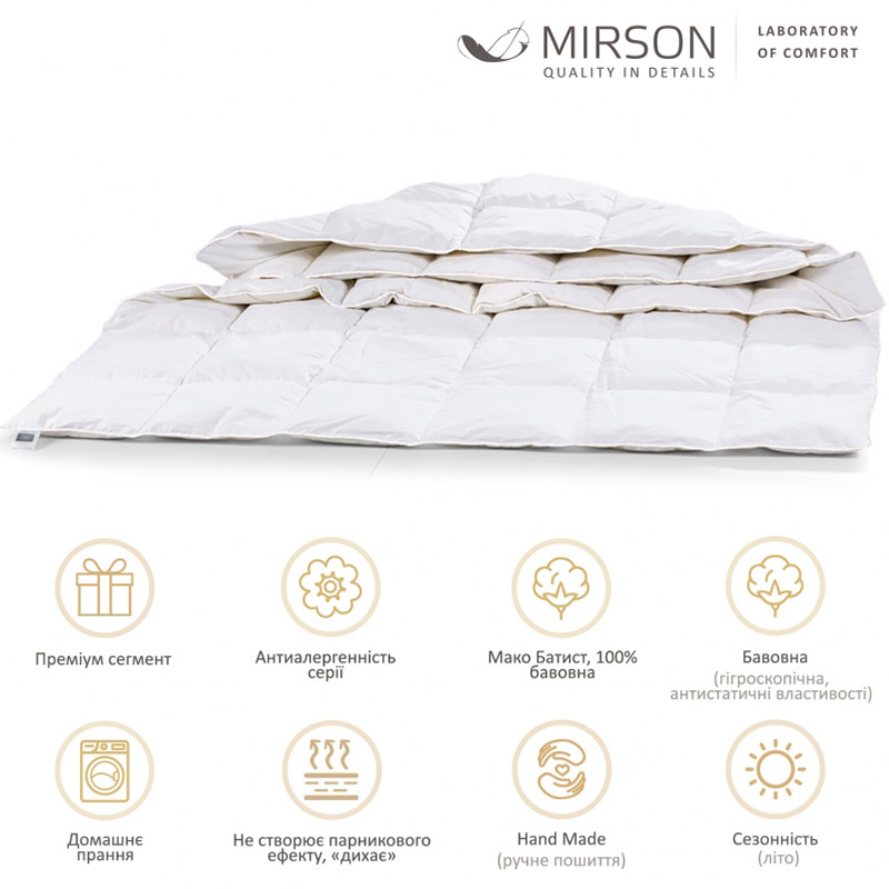 Элитное легкое и тонкое одеяло для лета. Одеяло с наполнителем из натурального хлопка и полиэфирного волокна. Хлопковый наполнитель хорошо поглощает и отводит излишки влаги, не парит, не вызывает аллергии. Наполнитель равномерно распределен и простеган по всему одеялу. Чехол выполнен из мягкого качественного итальянского мако-батиста белого цвета. Ткань легкая и натуральная, нежная и гладкая, шелковистая, прочная и долговечная.