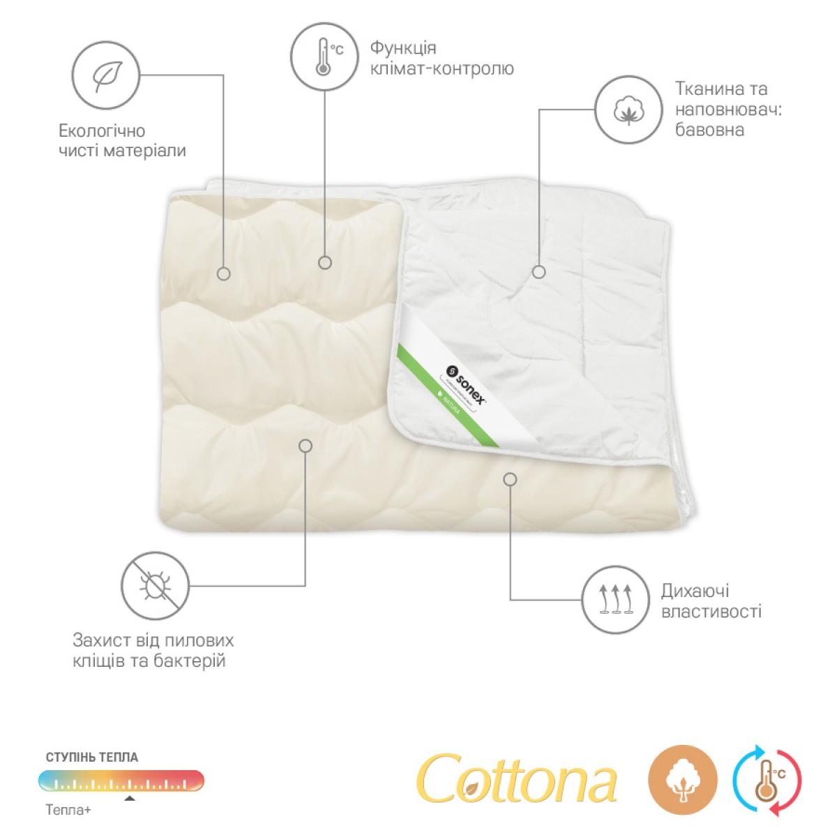 Одеяло Cottona обязательно понравится Вам, если Вы предпочитаете натуральные постельные принадлежности. Ткань и наполнитель выполнены из экологически чистого натурального хлопка. Наполнитель антиаллергенный, к тому же хорошо впитывает влагу. Хлопковое волокно обладает хорошей терморегуляцией и гигроскопичностью (хорошо впитывает влагу). Одеяло подходит для исользования в осенне-зимний период.