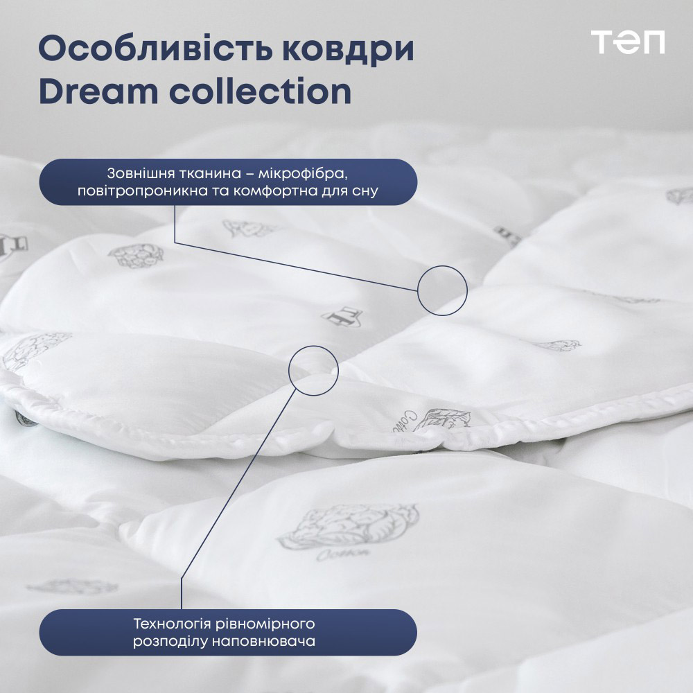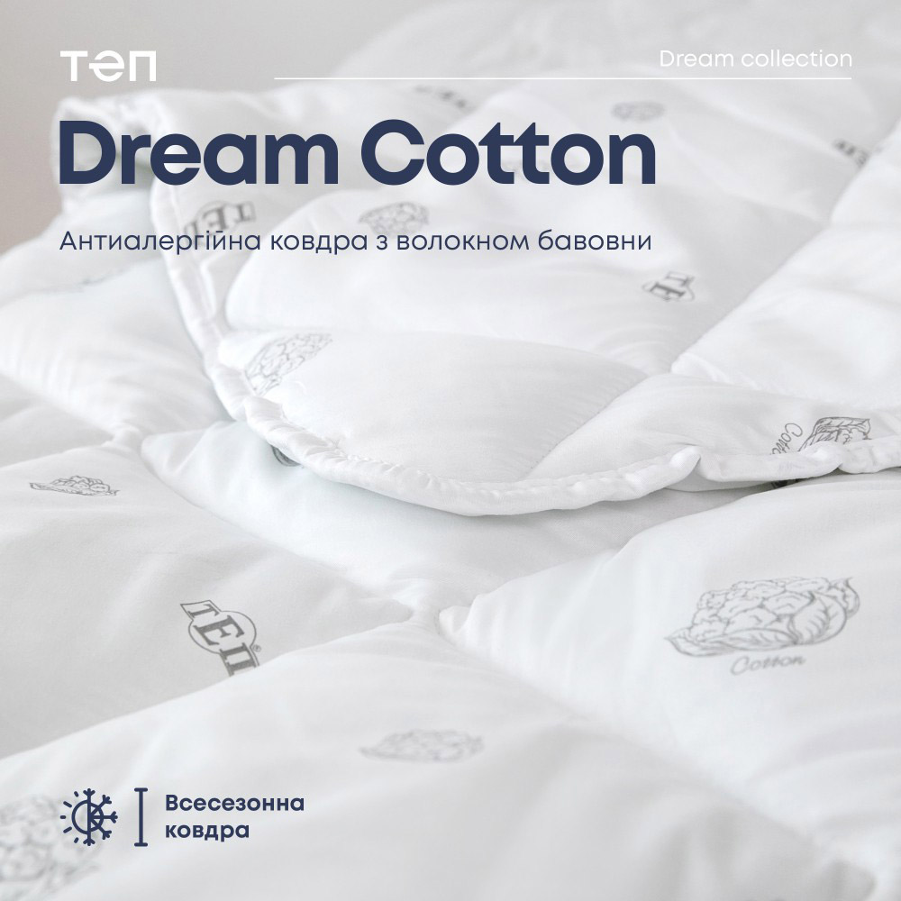 Одеяла Cotton из серии Dream Collection от ТМ ТЕП (Украина). Изделия с наполнителем из хлопка и полиэфирного волокна не вызывают аллергии, пригодны для стирки, обеспечивают комфортный сон и отдых. Одеяла комфортные, не накапливают влагу и запахи, отлично пропускают воздух, практичные и долговечные в эксплуатации.