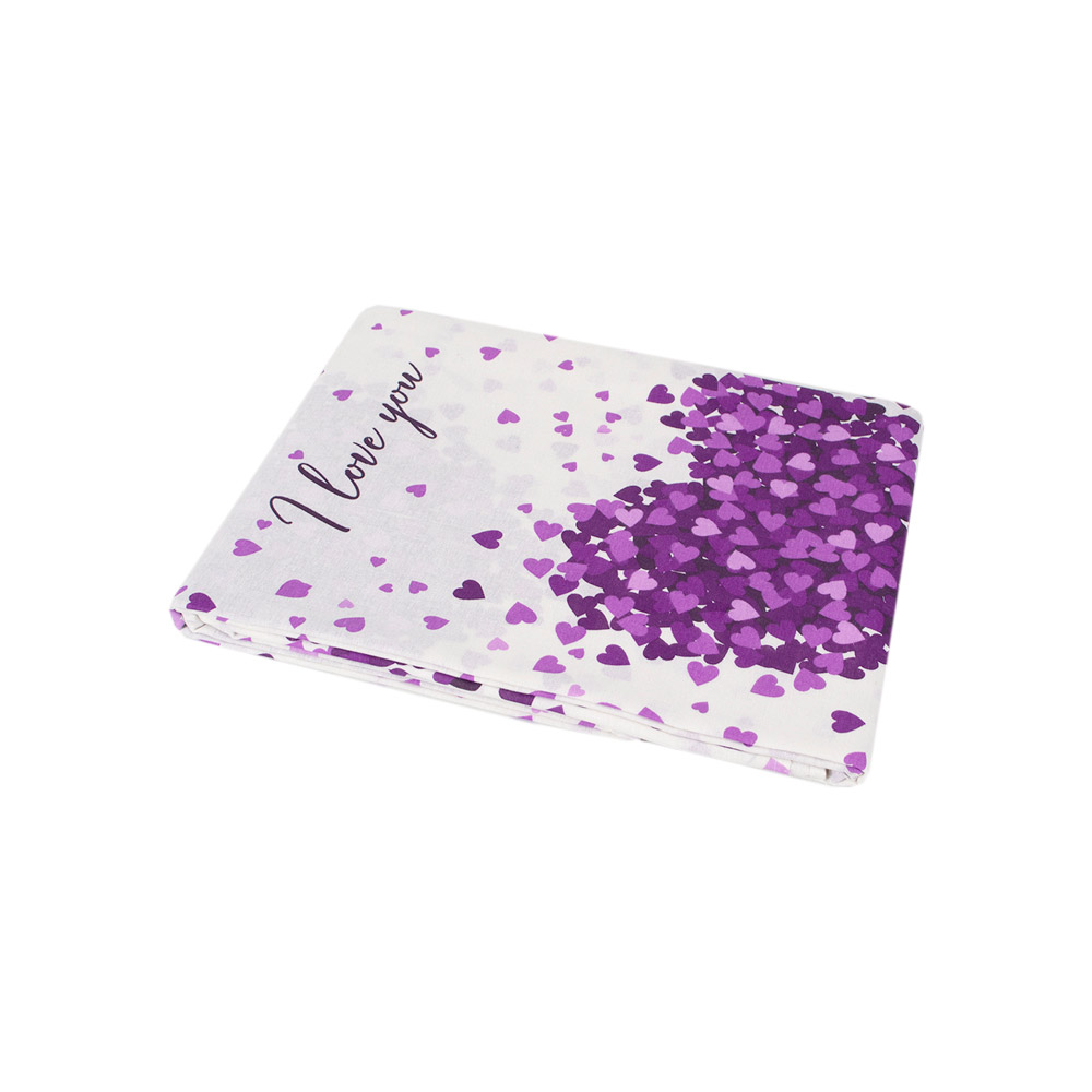 Бело-фиолетовая простынь из ранфорса с сердечками и романтическими надписями. Модель с резинкой по периметру. Качественная ткань из натурального хлопка приятная на ощупь, хорошо пропускает воздух, дарит комфортный сон. Простынь легко одевается на матрас и надежно фиксируется с помощью резинки, не сползает во время эксплуатации.