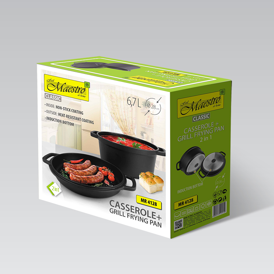 Кастрюля Maestro Cast с крышкой гриль 6,7л MR4128 выполнена из литого алюминия с термостойким покрытием, которое придает антипригарные свойства. Кастрюля имеет крышку, которую можно использовать как сковороду-гриль, что делает подобный набор функциональным и практичным. Сковорода-гриль с индукционным дном позволит готовить различные аппетитные блюда с румяной корочкой. Материал позволяет прослужить посуде долгое время, не подаваясь коррозии, деформации, воздействию высоких температур и обеспечивает равномерный прогрев. Торговая марка Maestro включает в себя широкий ассортимент посуды и мелких бытовых приборов для кухни, кухонные наборы и аксессуары. Выбирая посуду Maestro – Вы выбираете уют и комфорт на Вашей кухне. Данная продукция отличается оригинальным и современным дизайном. Ценовая политика демократична. Вся продукция сертифицирована, изготавливается исключительно из безопасных материалов.