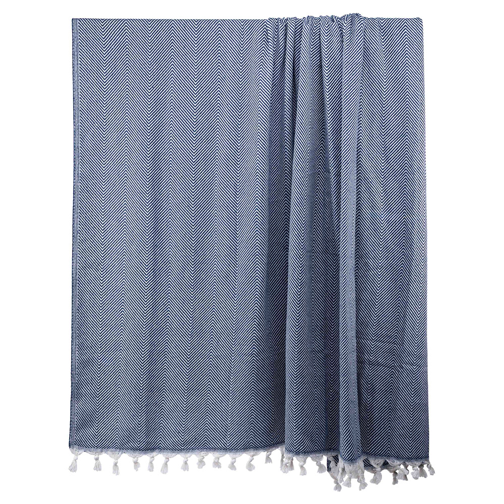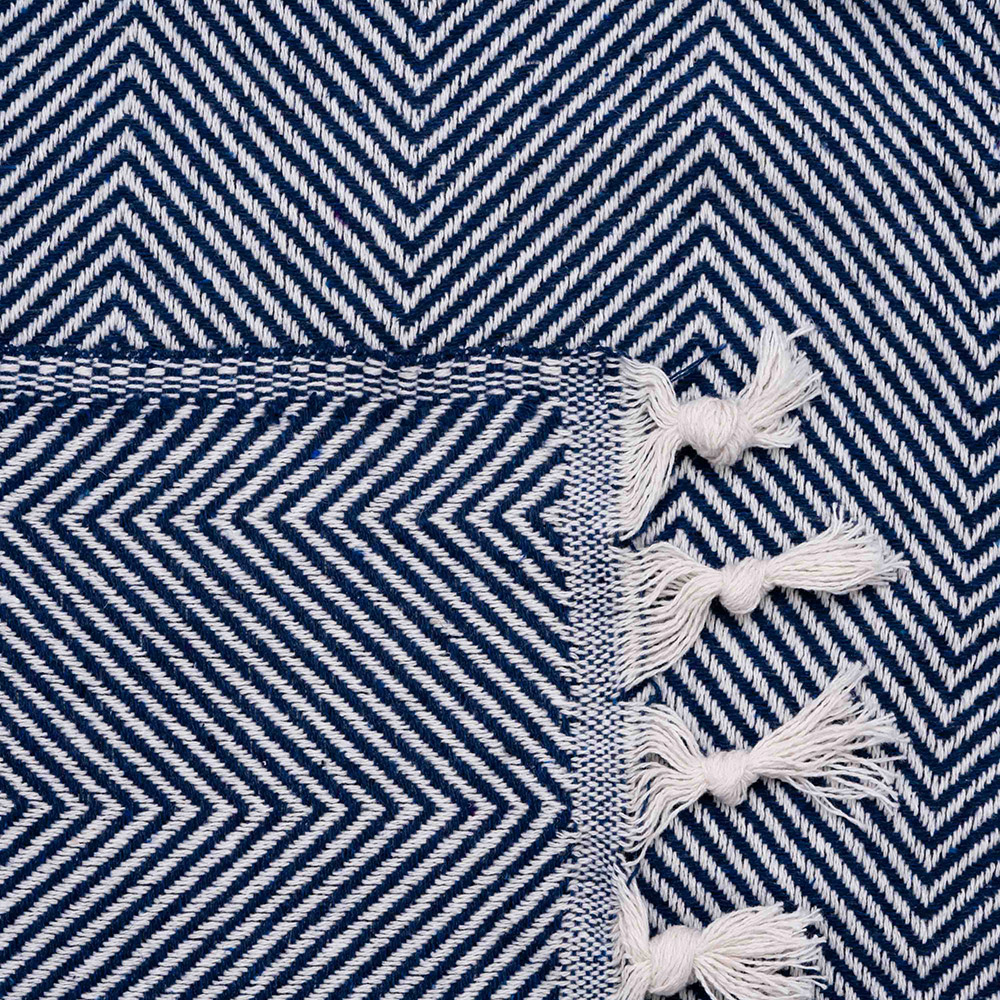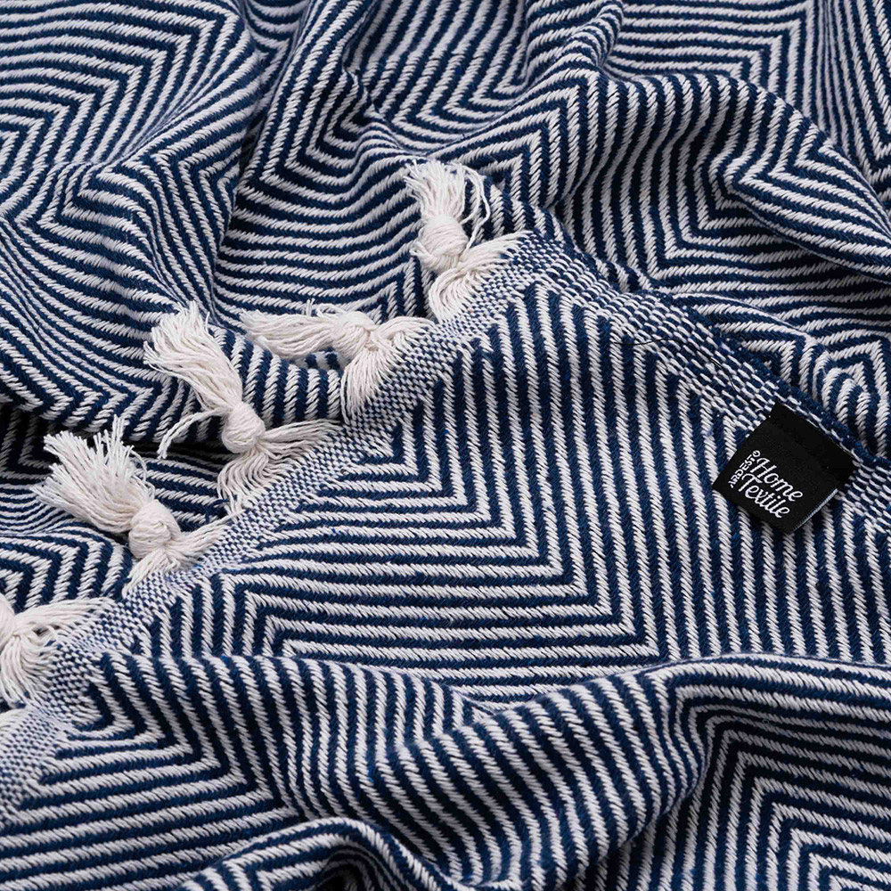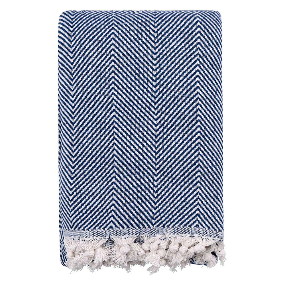 Хлопковый текстурный плед синего цвета с красивым рельефным узором-ёлочкой и с бахромой. Плед выполнен из натуральной хлопковой ткани. Материал мягкий и приятный на ощупь, хорошо пропускает воздух, дарит ощущение уюта и комфорта. Изделие можно использовать в качестве пледа, а также в качестве покрывала для создания уютной атмосферы в комнате.