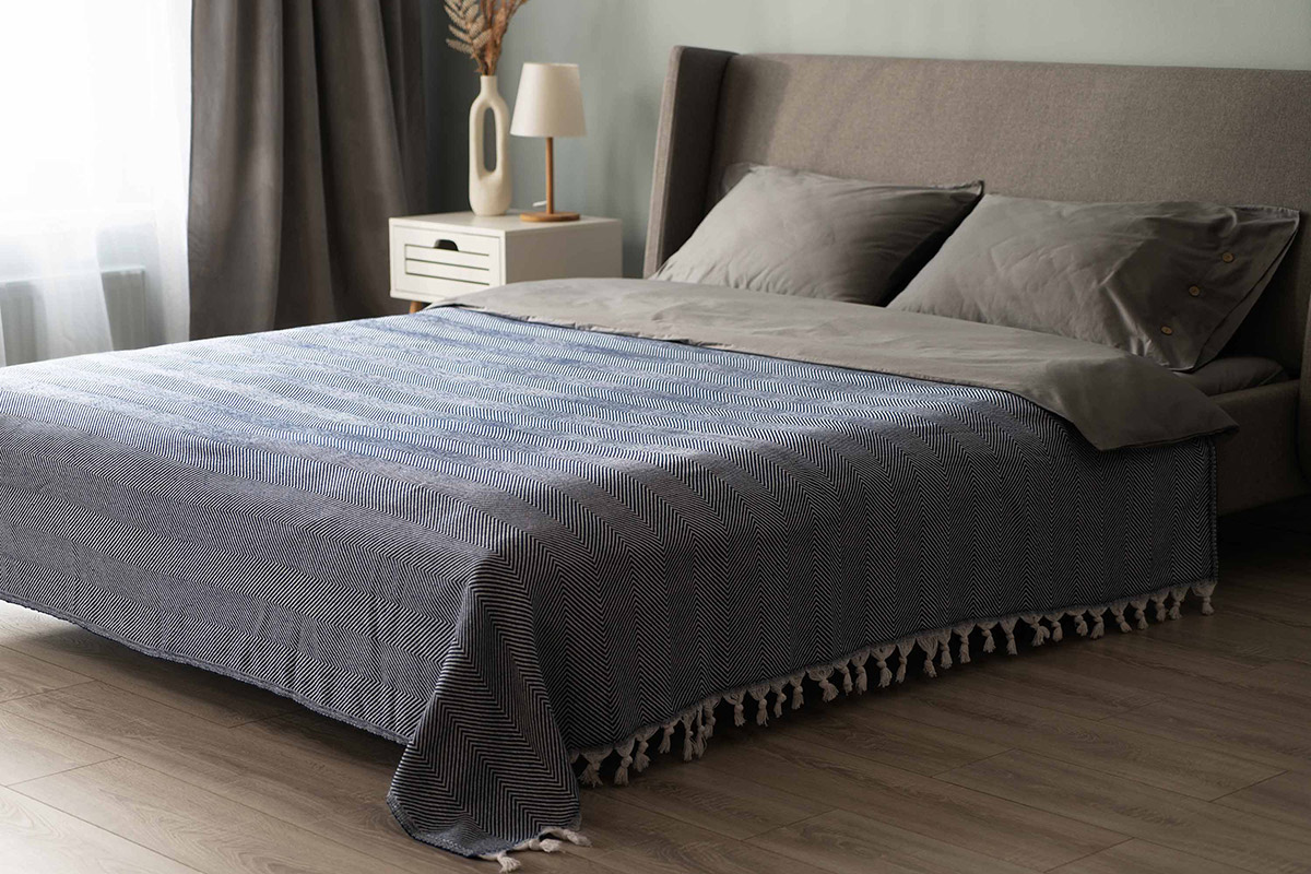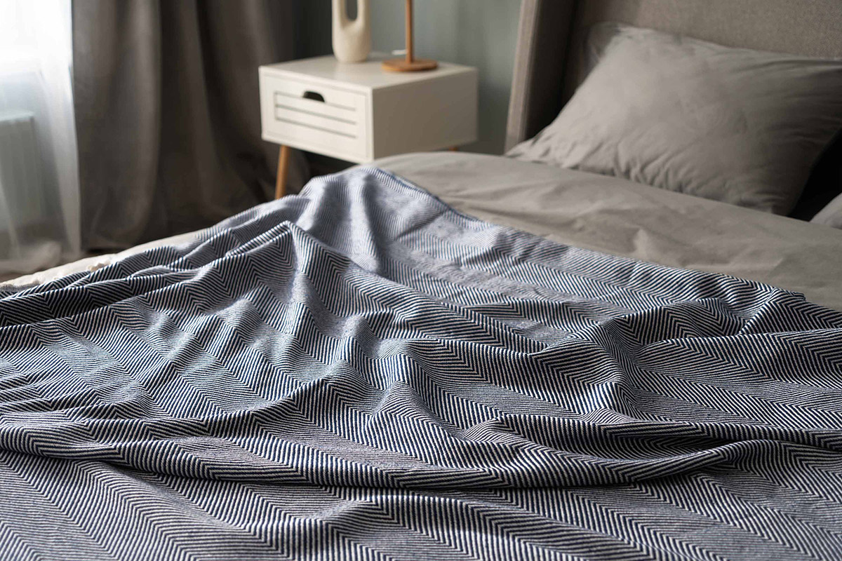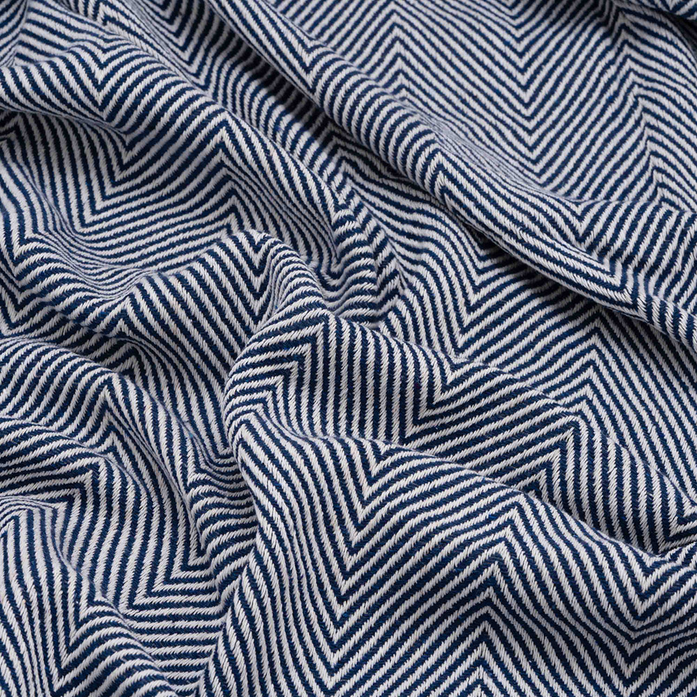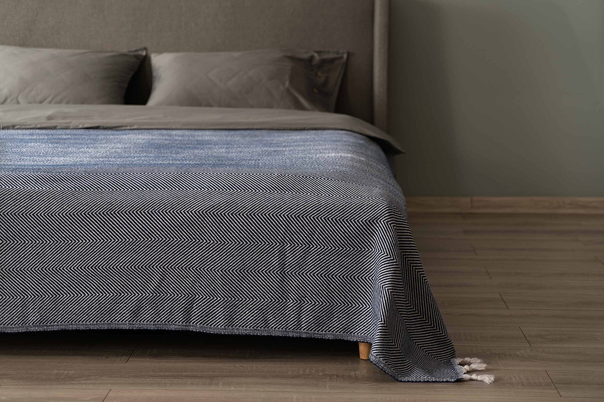 Хлопковый текстурный плед синего цвета с красивым рельефным узором-ёлочкой и с бахромой. Плед выполнен из натуральной хлопковой ткани. Материал мягкий и приятный на ощупь, хорошо пропускает воздух, дарит ощущение уюта и комфорта. Изделие можно использовать в качестве пледа, а также в качестве покрывала для создания уютной атмосферы в комнате.