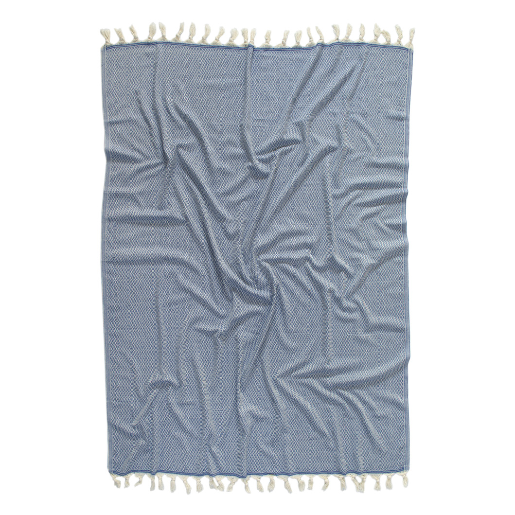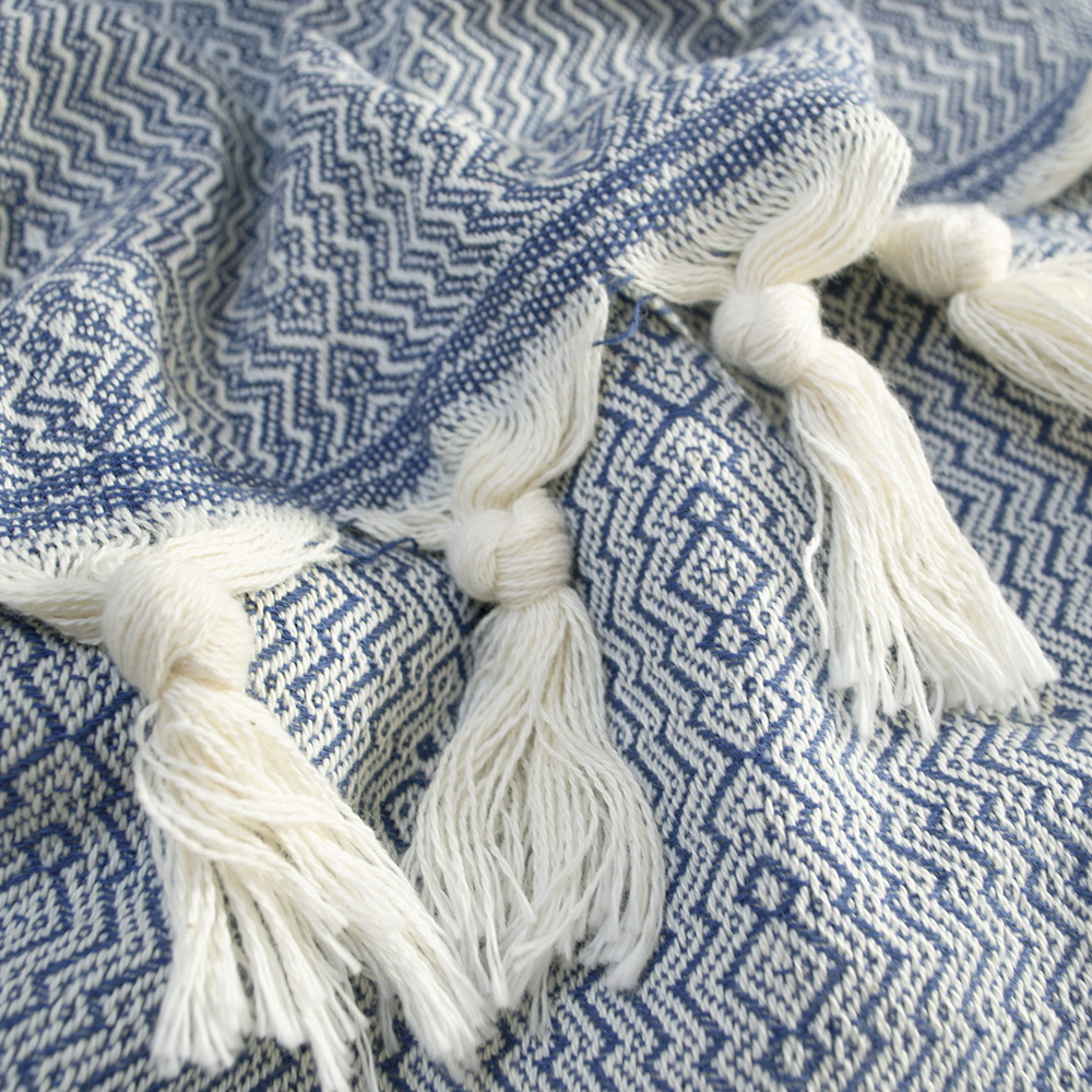 Натуральный хлопковый плед синего цвета с жаккардовым узором и бахромой. Плед станет изюминкой интерьера и подарит вам комфортный отдых.