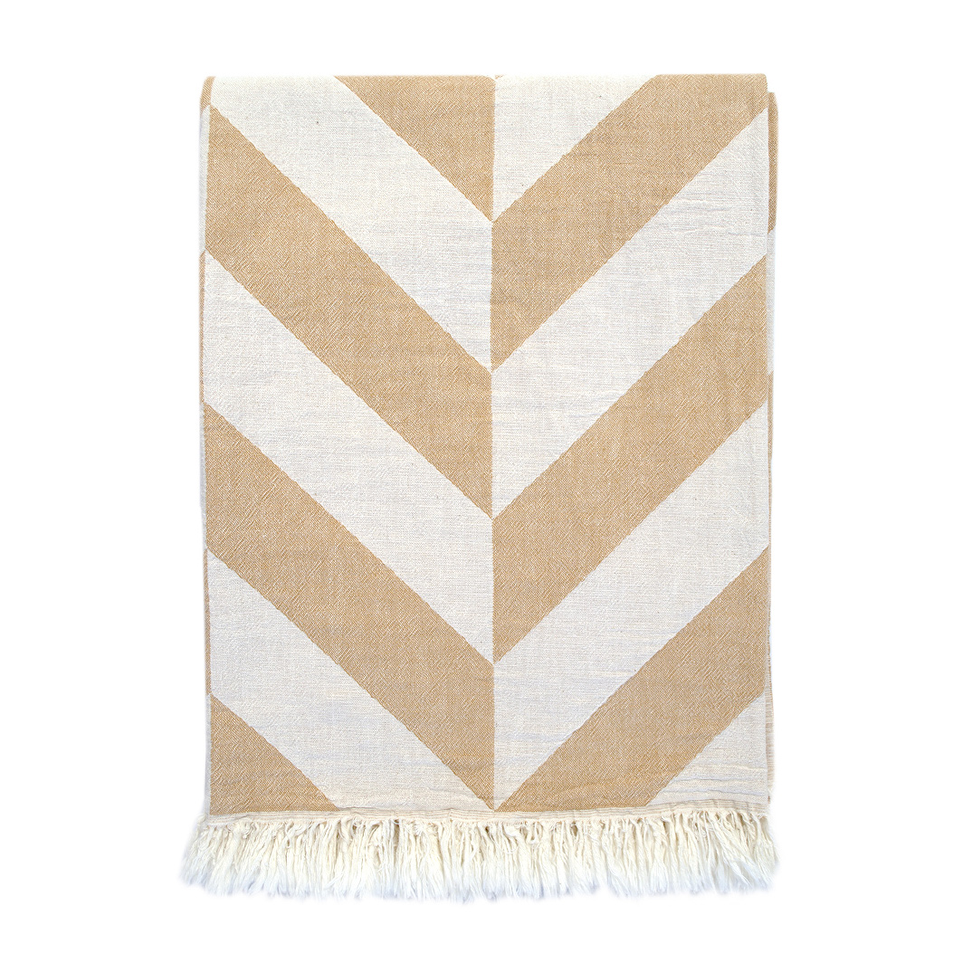 Лёгкий плед из 100% хлопка с модным графическим принтом горчичного цвета и бахромой. Плед мягкий на ощупь, подарит вам уют и комфорт во время отдыха.
