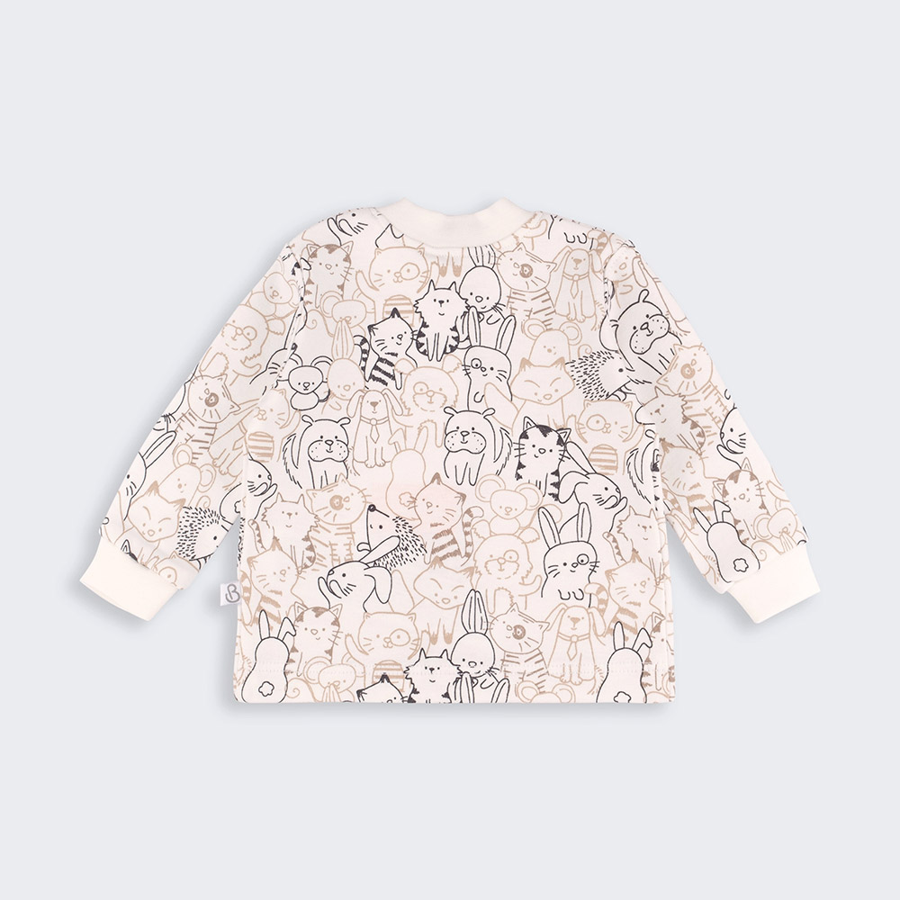 Кофточка молочного цвета с симпатичным детским принтом. Модель универсальная, подойдет и для мальчика, и для девочки. Кофточка прямого кроя, с длинными рукавами на манжетах, по всей длине застегивается на кнопки. Модель выполнена из интерлока. Ткань из натурального хлопка, мягкая и приятная, обеспечит малышу максимальный комфорт и уют.