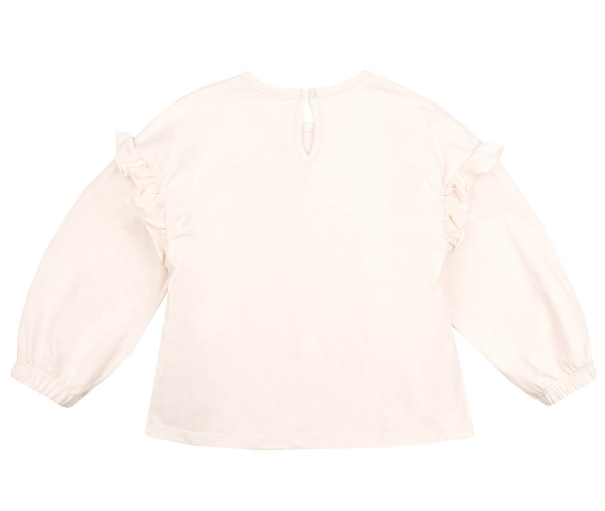 Лонгслив молочного цвета. Модель подойдет для девочки. Лонгслив с круглой горловиной, сзади на спинке застегивается на пуговицу, спереди симпатичный принт. Рукава длинные, внизу собраны на резинку. На плечах декоративные рюши.