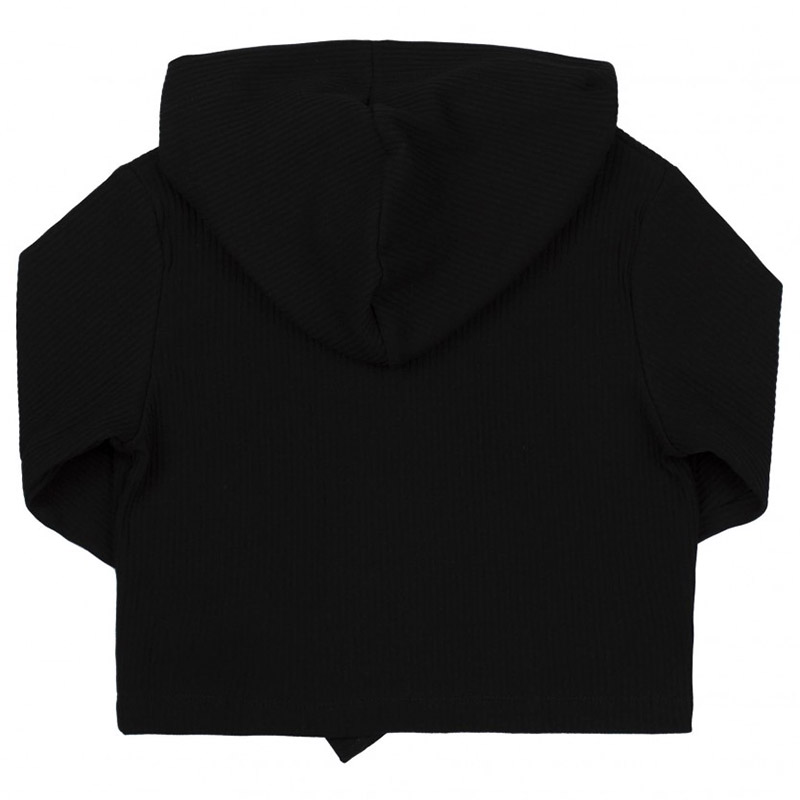 Однотонная стильная кофта черного цвета. Модель подойдет для девочки. Кофта укороченная, с капюшоном, с длинными рукавами и центральной застежкой-молнией. Кофта выполнена из трикотажной ткани в рубчик. Материал из натурального хлопка обеспечивает максимальный комфорт и мягкость при носке, делая кофту идеальным выбором для ребенка. Кофта станет не только модным элементом детского гардероба, но и практичной одеждой для повседневной носки.