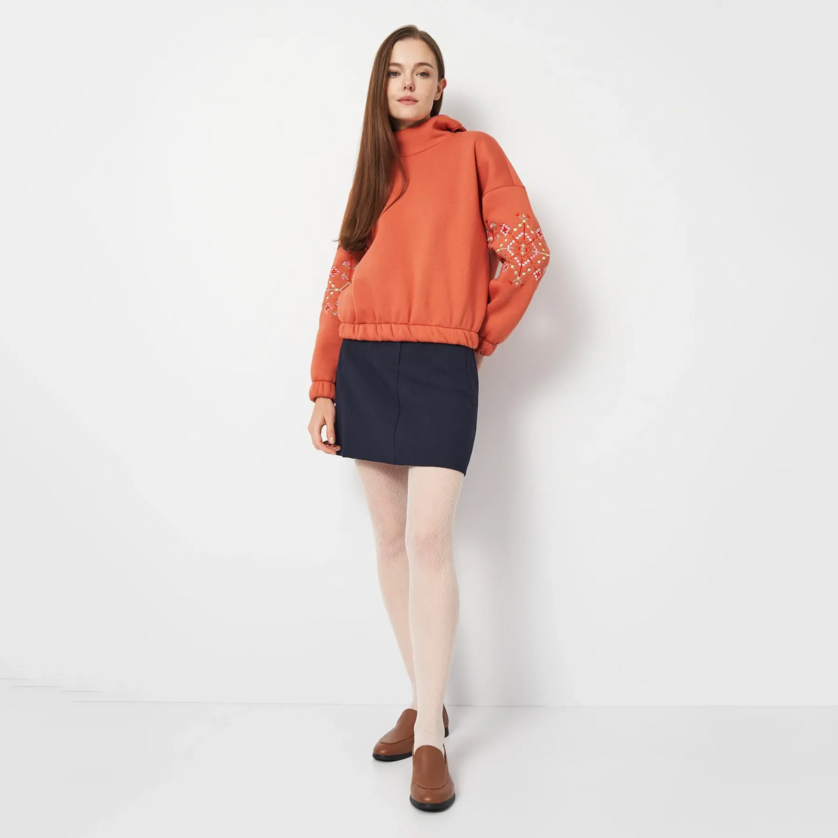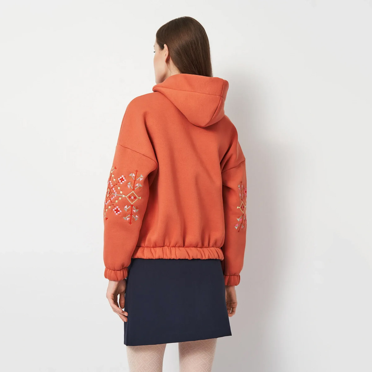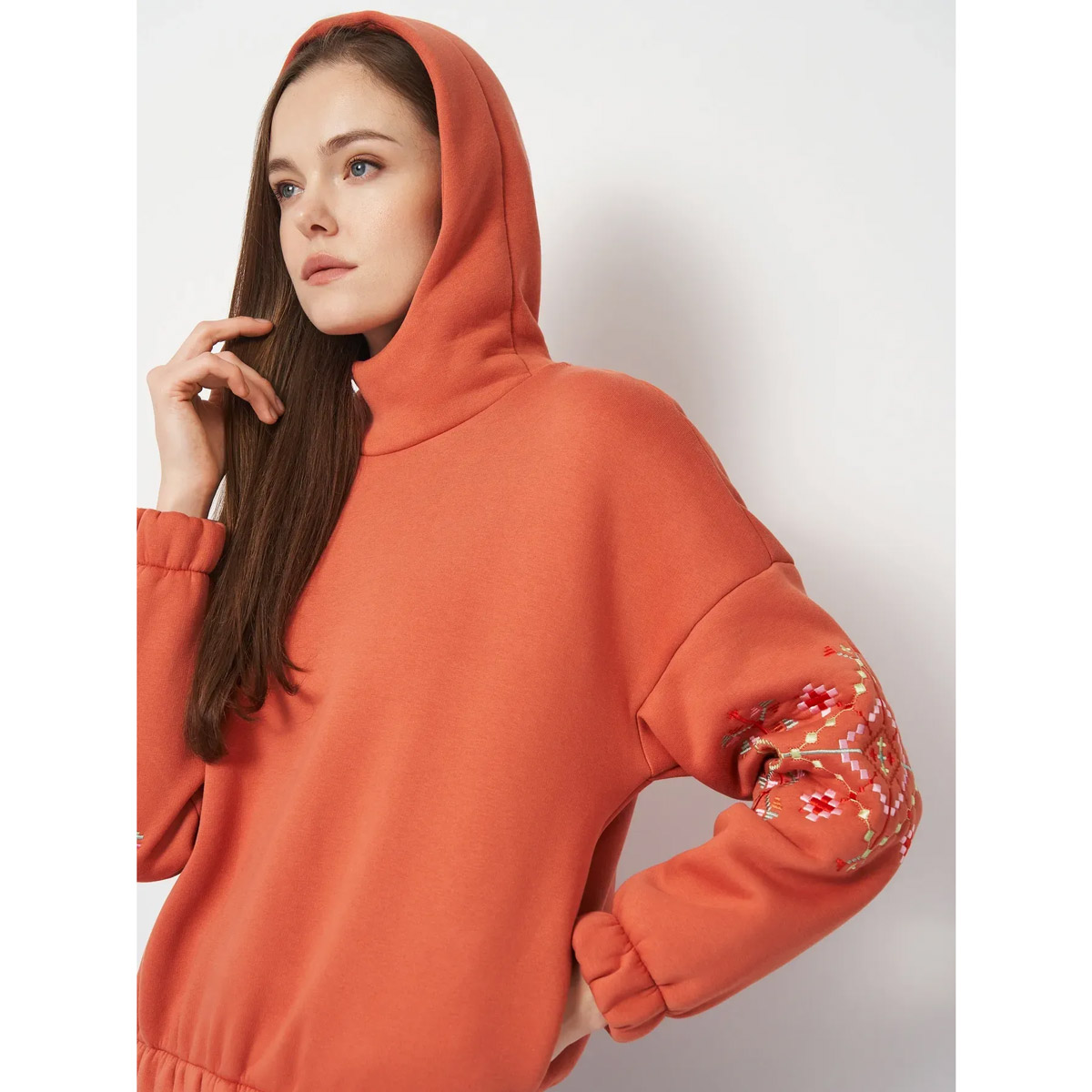 Женское худи кораллового цвета с вышивкой — комфортная модель свободного кроя для повседневной носки. Изготовлено из мягкого гребенного футера трёхнитка чесаная, который сохраняет тепло, не скатывается и хорошо держит форму. Спущенное плечо, стильный капюшон и скрытые карманы в боковых швах обеспечивают удобство и аккуратный внешний вид. Низ и рукава на мягкой резинке. Яркая машинная вышивка гладью на рукавах гармонично сочетает спортивный стиль с эстетикой украинских традиций.