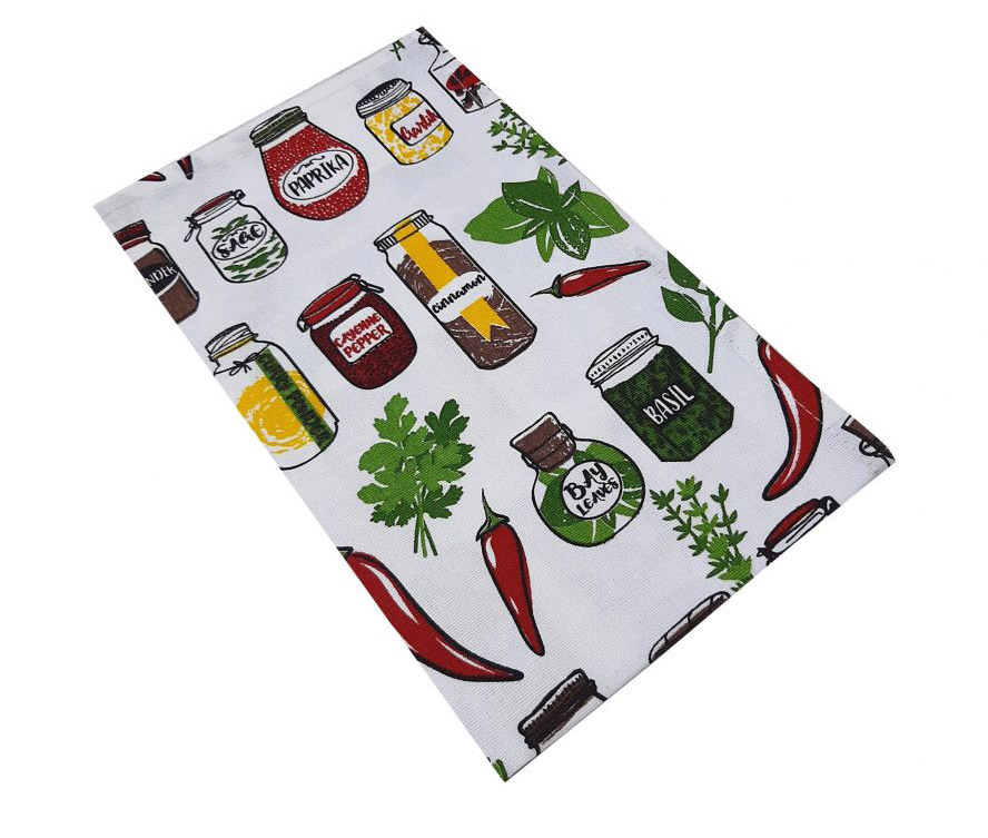 Кухонное полотенце из натуральной хлопковой ткани. Симпатичный разноцветный принт с изображением специй замечательно дополнит интерьер кухни. Материал из 100% хлопка прекрасно поглощает влагу и быстро сохнет.