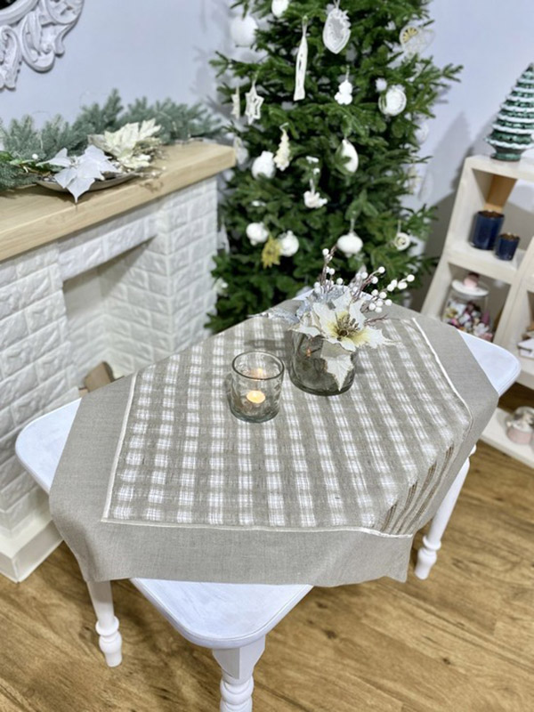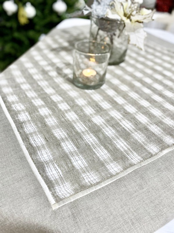 Скатерть-настольник из натуральной льняной ткани представляет собой прекрасный выбор для тех, кто ценит красоту, комфорт и экологичность в своем доме. Нейтральный серо-бежевый оттенок замечательно впишется в любой интерьер. Полупрозрачные клеточки в центре придают скатерти элегантный вид. Скатерть из 100% льна обладает множеством преимуществ, таких как высокая прочность и долговечность в эксплуатации, износостойкость, практичность.