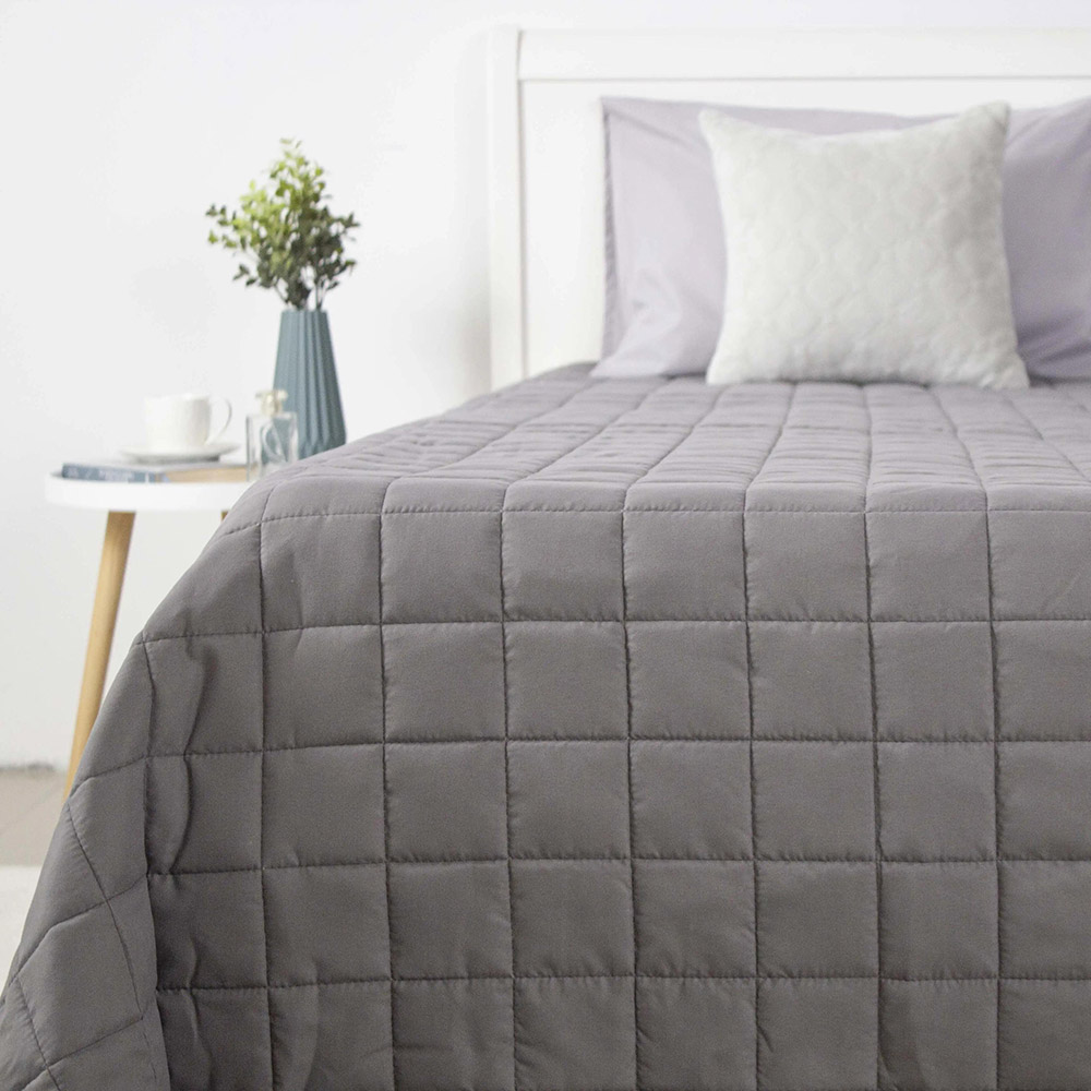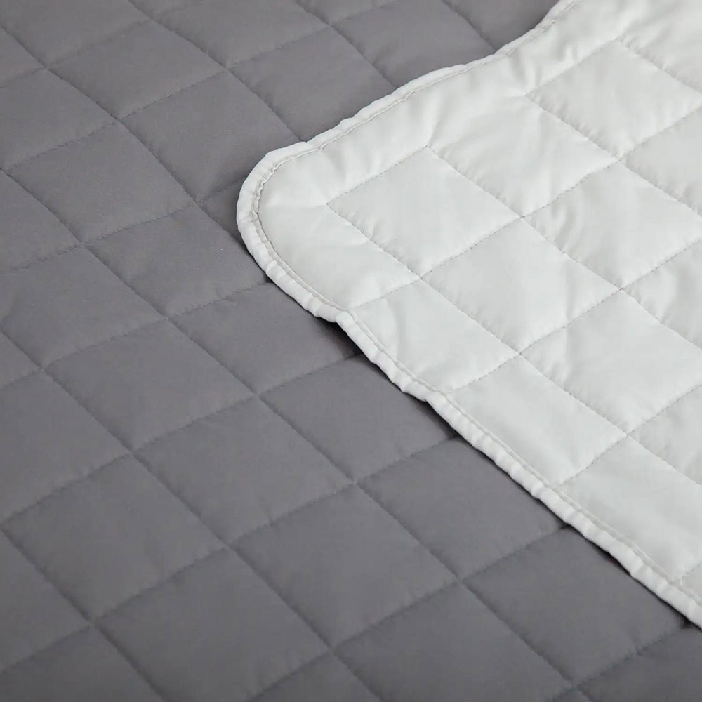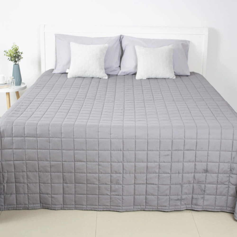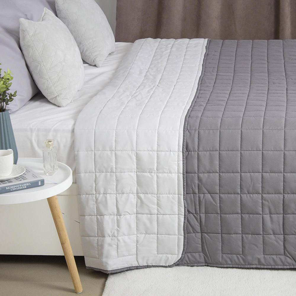 Покрывало двустороннее, выполнено в спокойной палитре: одна сторона — серый цвет, другая — белый. Изделие простёгано аккуратными квадратами, что придаёт ему объём и обеспечивает равномерное распределение наполнителя. Верх изготовлен из приятной на ощупь микрофибры, а в качестве наполнителя использовано силиконизированное волокно — лёгкое, воздушное и хорошо удерживающее тепло. Такое покрывало идеально подойдёт для создания уютной атмосферы в спальне и станет стильным дополнением интерьера.