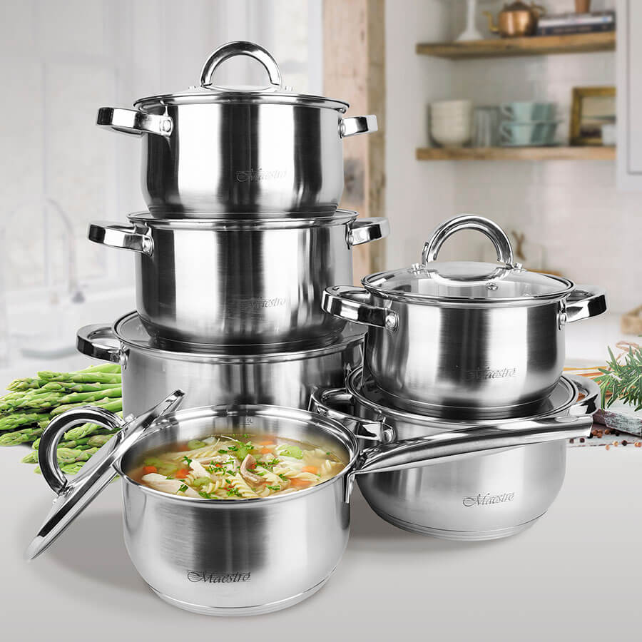 Набор посуды универсальный Maestro MR2120 серебро. Состоит из 12 предметов. В комплекте стеклянные крышки с отверстием для выхода пара. Оборудованы удобными ручками. Вся посуда имеет многослойное термоаккумулирующее дно, что способствует равномерному распределению тепла во время приготовления. Подходит для всех типов плит.