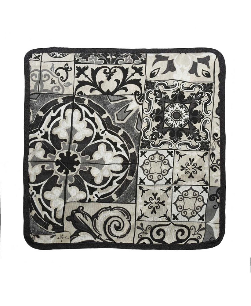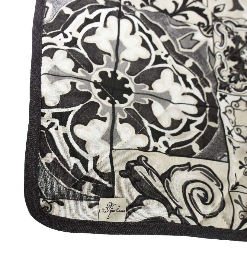 Мягкий и тонкий чехол с красивым орнаментом в черно-белой цветовой гамме. Накладка на табурет выполнена из практичной ткани на основе хлопка и полиэстера, с наполнителем из ватина. Изделие крепится с помощью 4 резиночек по углам, делает сиденье табурета более удобным.