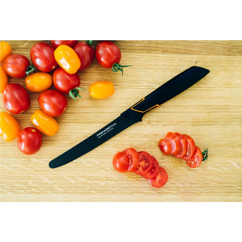 Нож для томатов 13 см Edge Fiskars 1003092. Удобный универсальный нож среднего размера с зубчатым лезвием для нарезания овощей и фруктов с тонкой кожурой. Также может быть использован для сервировки стола.