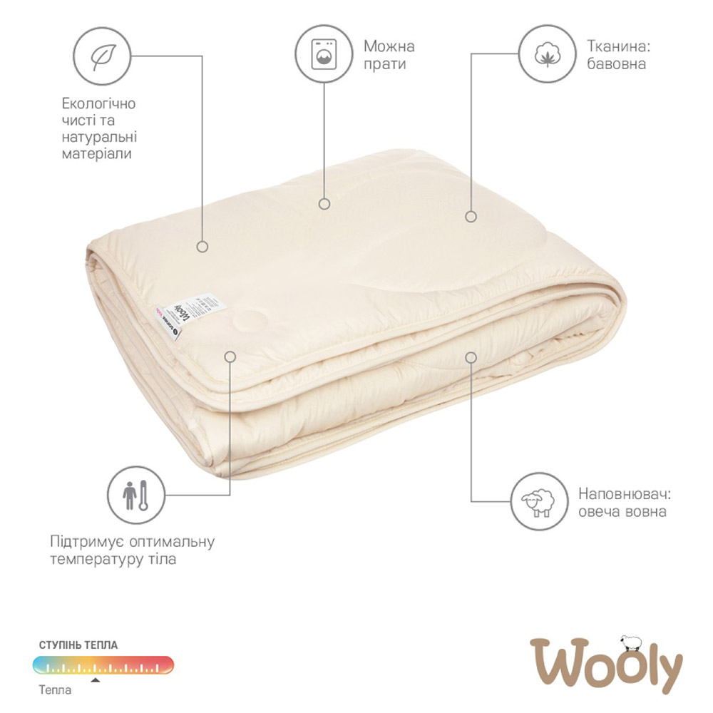 Детское шерстяное одеяло всегда будет дарить малышу тепло и уют во время сна, создавая оптимальный сухой микроклимат в кроватке. Одеяло производится из натуральной овечьей шерсти в чехле из 100% хлопка бежевого цвета.
