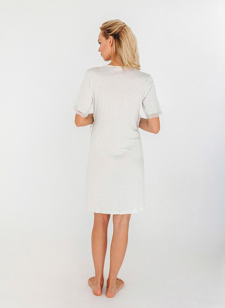 Удобная и красивая домашняя одежда для будущих мам. Халатик лёгкий, приятный на ощупь, выполнен из нежного белого материала с красивой кружевной отделкой.