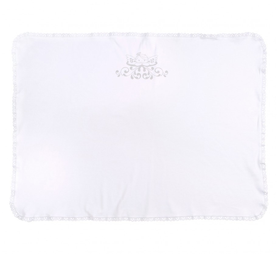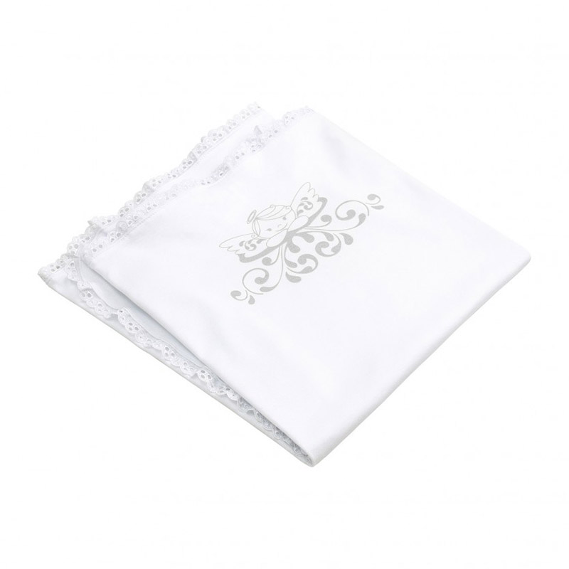 Крыжма белого цвета, размером 70х95 см. Крыжма с красивым принтом с ангелочком, по периметру декорирована кружевом.