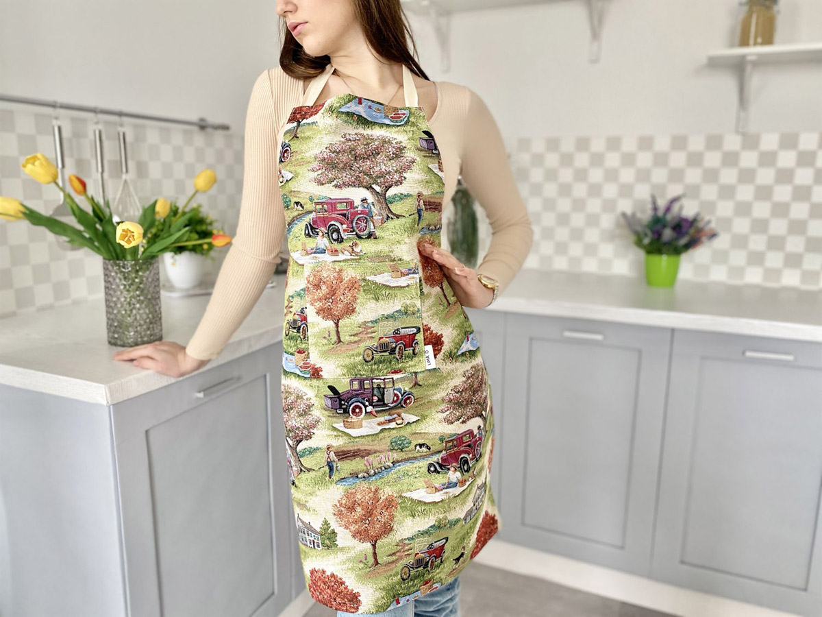 Гобеленовый фартук в зеленой цветовой гамме с красивым пасторальным рисунком и большим удобным карманом. Деревья и лужайки замечательно дополнят интерьер кухни. Передник выполнен из качественного и плотного материала, прослужит долгое время, сохранив привлекательный вид и первоначальный цвет.