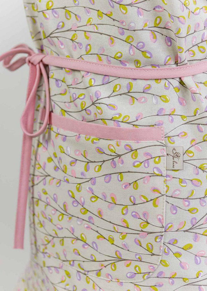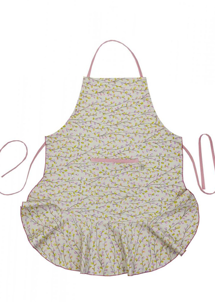 Фартук выполнен из качественного испанского материала с красивым растительным принтом, удобным большим карманом и воланом по нижнему краю. Ткань из натурального хлопка приятная на ощупь, практичная и долговечная в эксплуатации. Фартук станет незаменимым на кухне, отлично защитит одежду во время приготовления пищи.