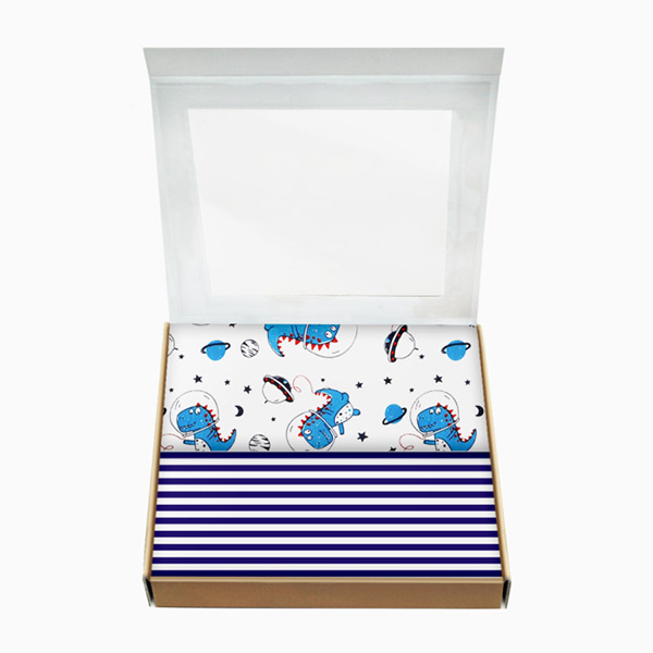 Набор состоит из двух пеленок. Одна пеленка белого цвета с симпатичным рисунком с динозаврами, а другая - с бело-синими полосками.