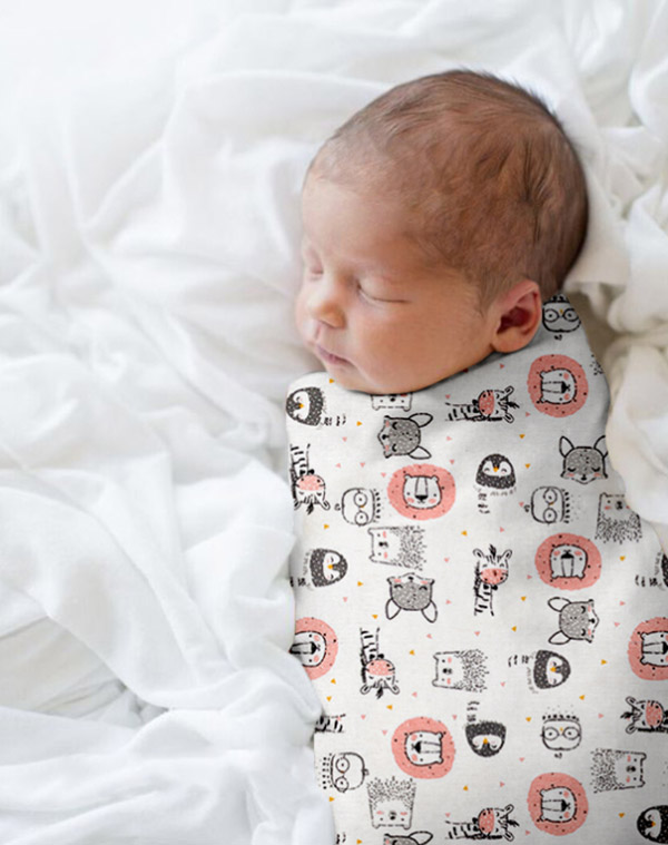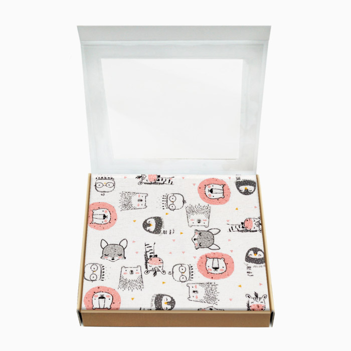 Пеленка в бело-розовой цветовой гамме с симпатичным принтом с животными.