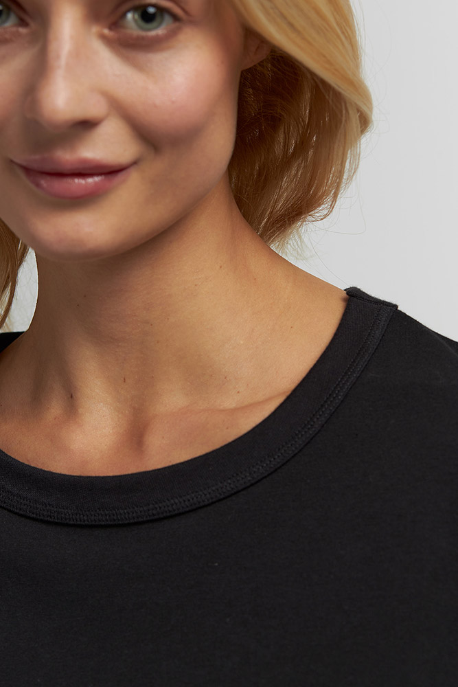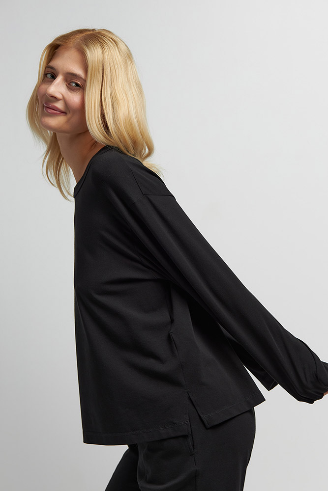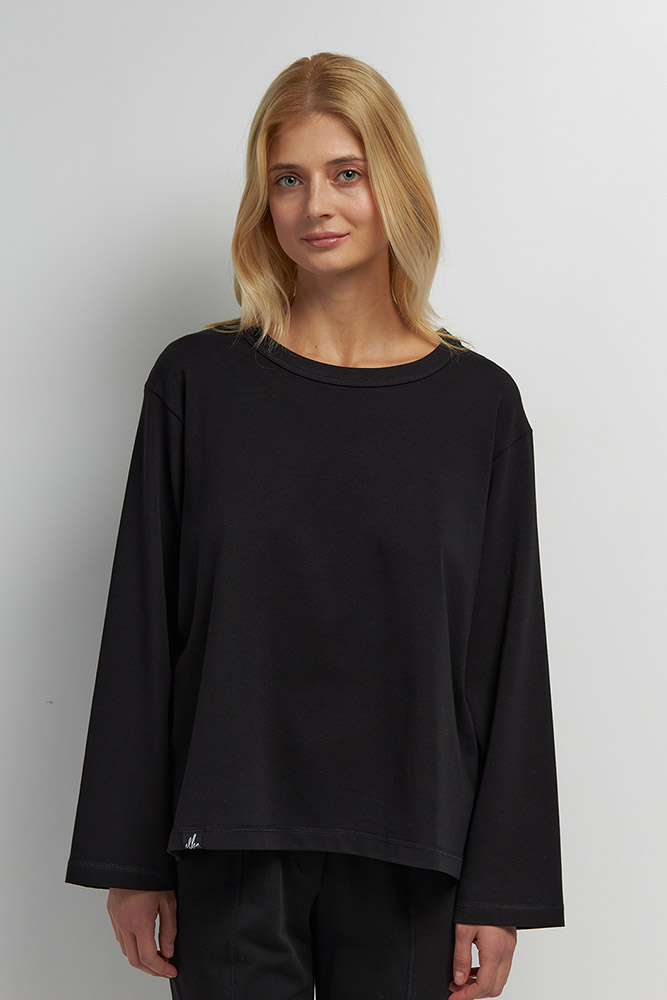 Женский однотонный лонгслив черного цвета. Модель свободного кроя, с круглой горловиной и длинными рукавами. Идеальный вариант для комфортного сна и отдыха в уютной домашней обстановке. Мягкая и приятная к телу ткань на основе волокон хлопка и модала отлично пропускает воздух, дарит ощущение комфорта и уюта.
