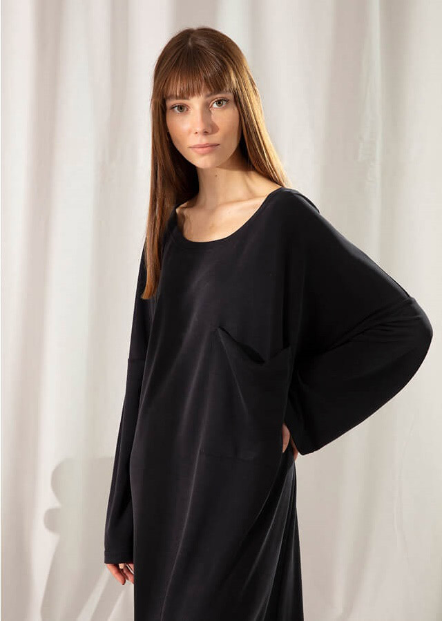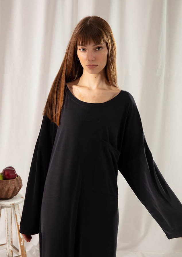 Эффектное длинное платье черного цвета. Модель свободного кроя, с большим карманом, круглым вырезом и боковыми разрезами внизу. Платье легкое и свободное, мягкое и приятное на ощупь, выполнено из качественной ткани на основе модала. Изделие станет оригинальным и стильным акцентом в домашнем гардеробе.