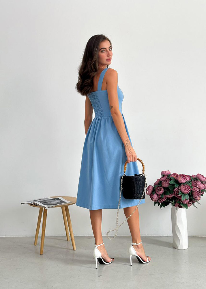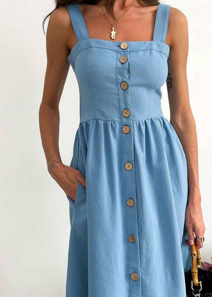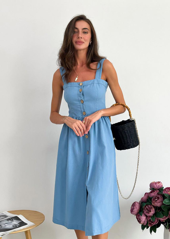 Замечательное летнее платье на пуговицах. Модель на широких бретелях, однотонная, голубого цвета, выполнена из натуральной ткани на основе хлопка и льна. Платье сочетает комфорт и элегантность, позволяет вам выглядеть стильно в летнюю жару. Натуральный материал легкий и приятный на ощупь, прекрасно пропускает воздух, гипоаллергенный, не электризуется. Это платье идеально сочетается с аксессуарами разных оттенков и может быть дополнено шляпой, сумкой или парой стильных сандалий. Это платье станет отличным выбором для модных женщин, стремящихся выглядеть элегантно и чувствовать себя комфортно во время летнего сезона.